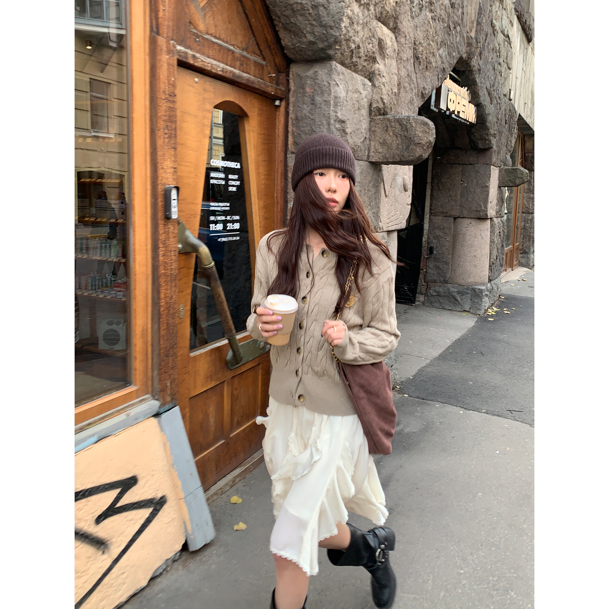 pusumede 秋日部落 圆领麻花毛衣开衫女长袖针织衫外套气质上衣