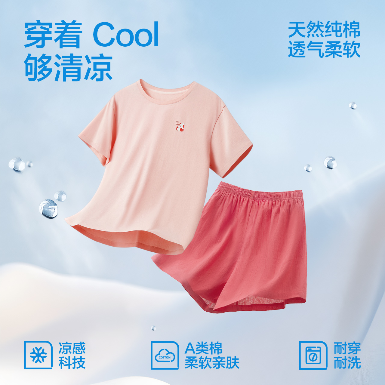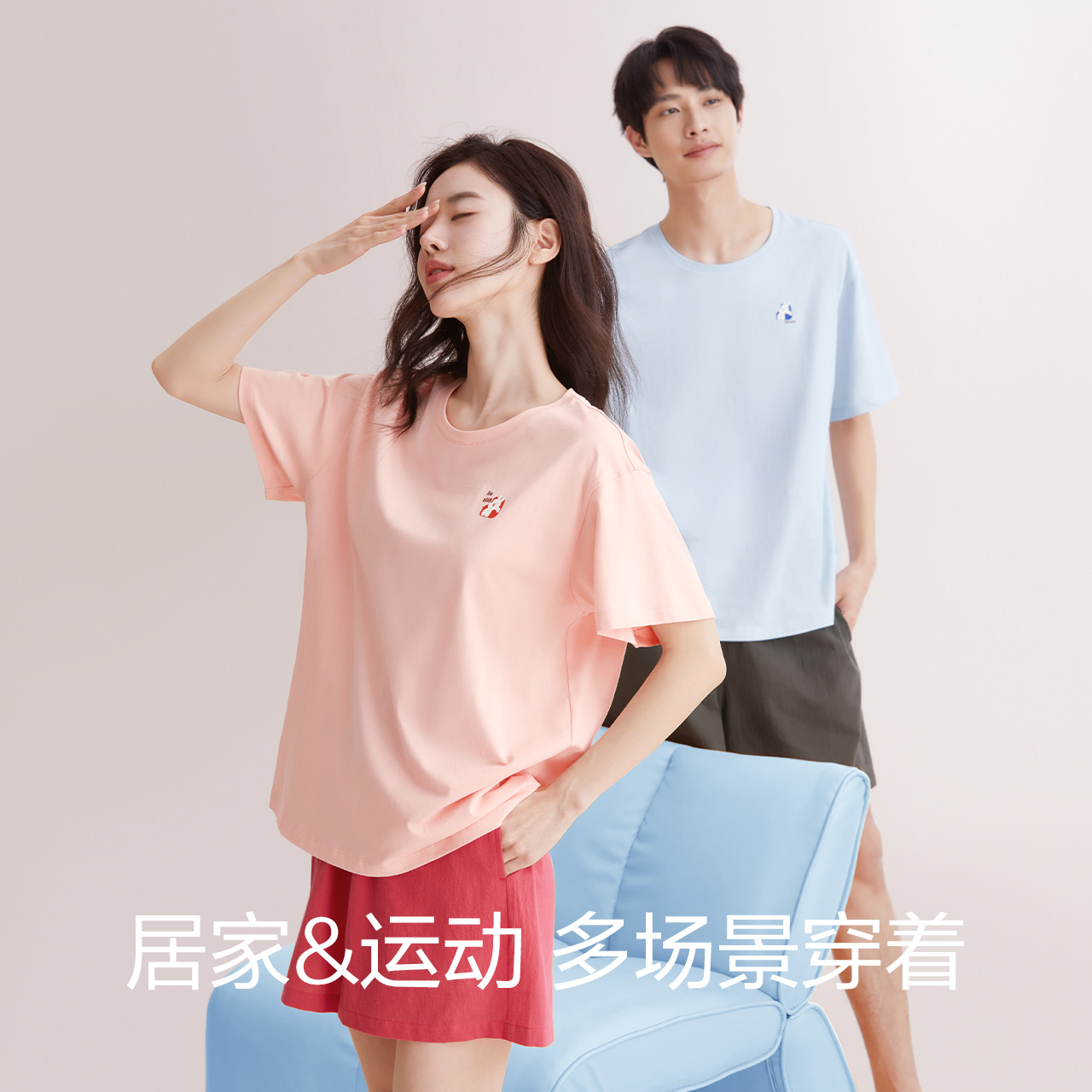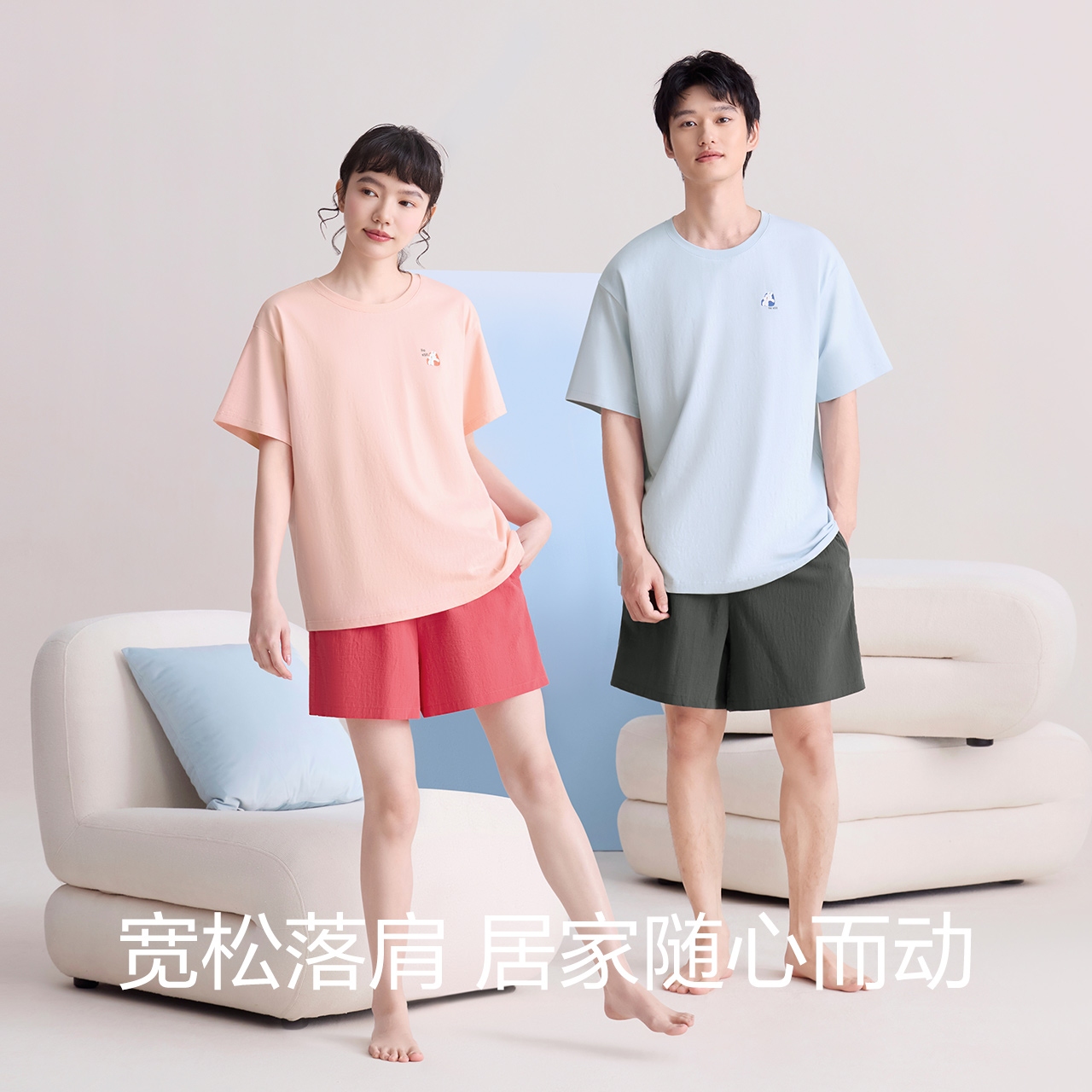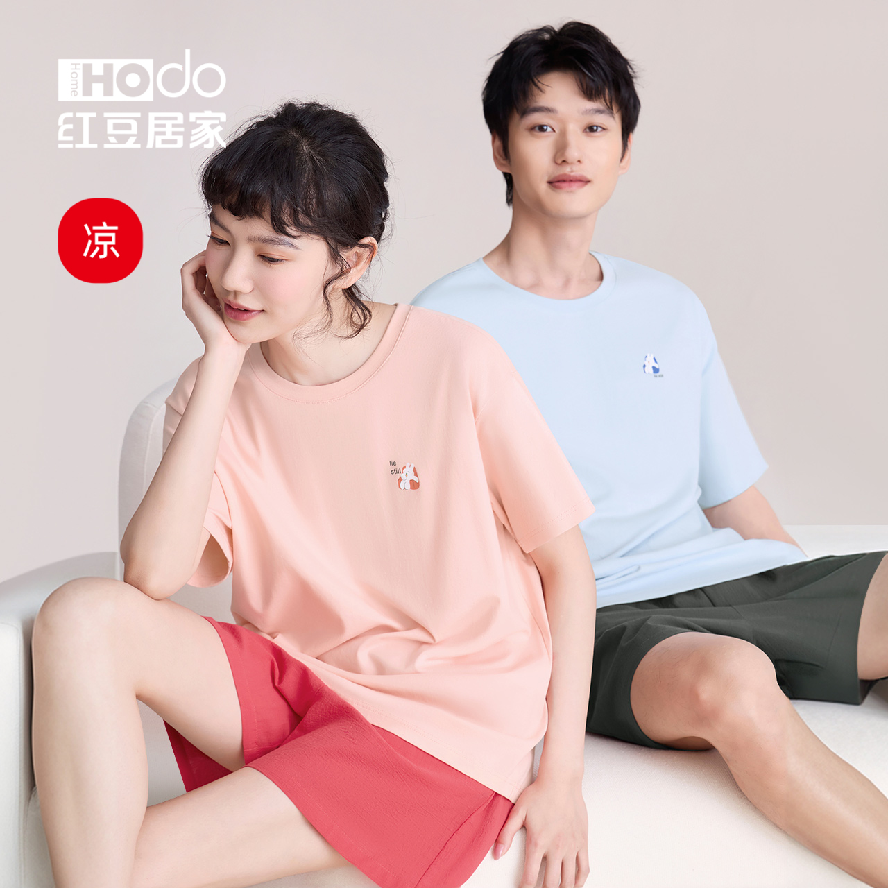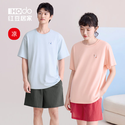 红豆纯棉睡衣夏季情侣短袖短裤套头可外穿薄款T恤宽松男女家居服