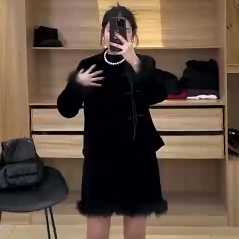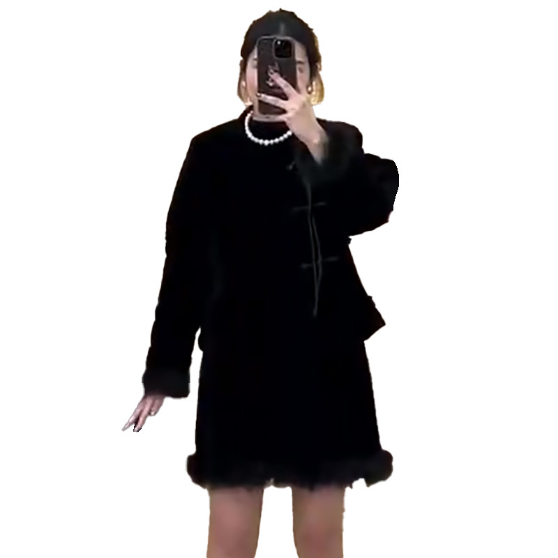 新中式拼毛加棉上衣半身裙平绒套装胖mm2025冬季显瘦宽松大码女装