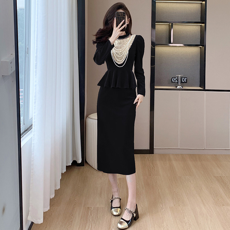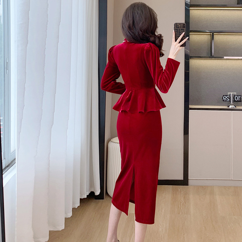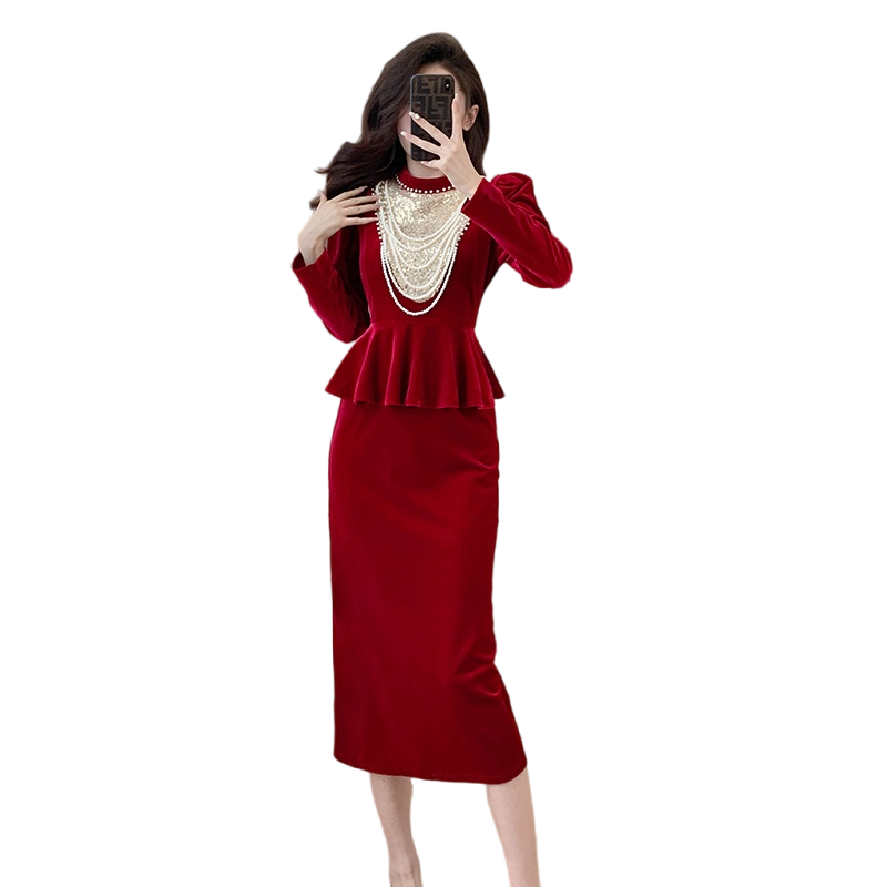 酒红色金丝绒连衣裙女秋冬气质名媛包臀中长款假两件宴会礼服裙子