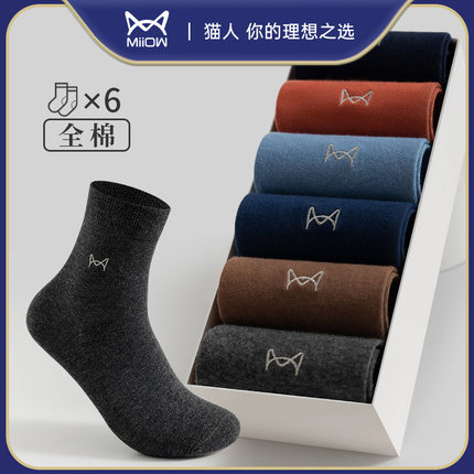 猫人袜子纯棉男款中筒袜男士防臭袜子黑色商务抗菌透气男式长袜
