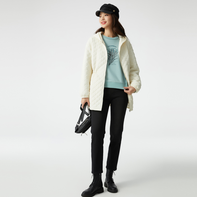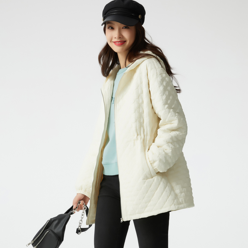 布景棉服女中长款秋季新品简约可收腰设计连帽薄款中长款外套1059