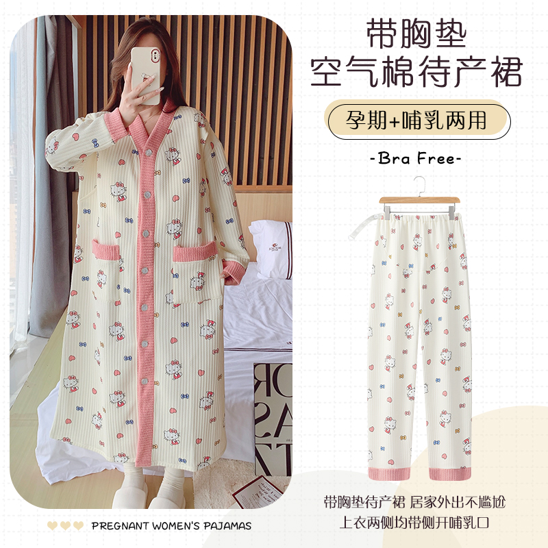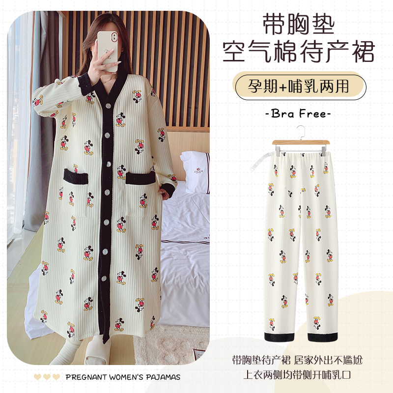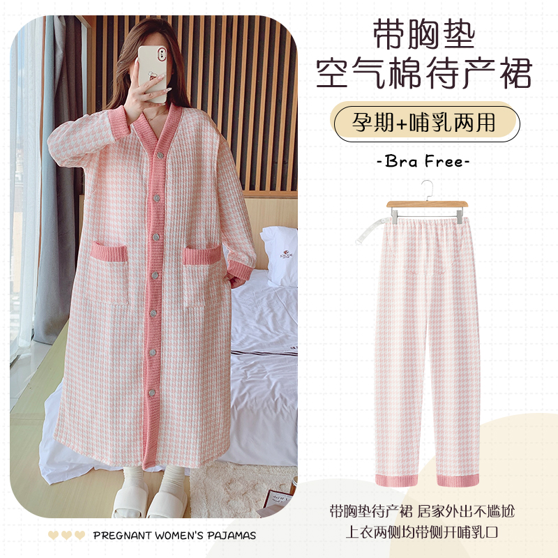带胸垫空气棉春秋冬季纯棉加厚产后喂奶哺乳睡裙月子服孕妇托腹裤