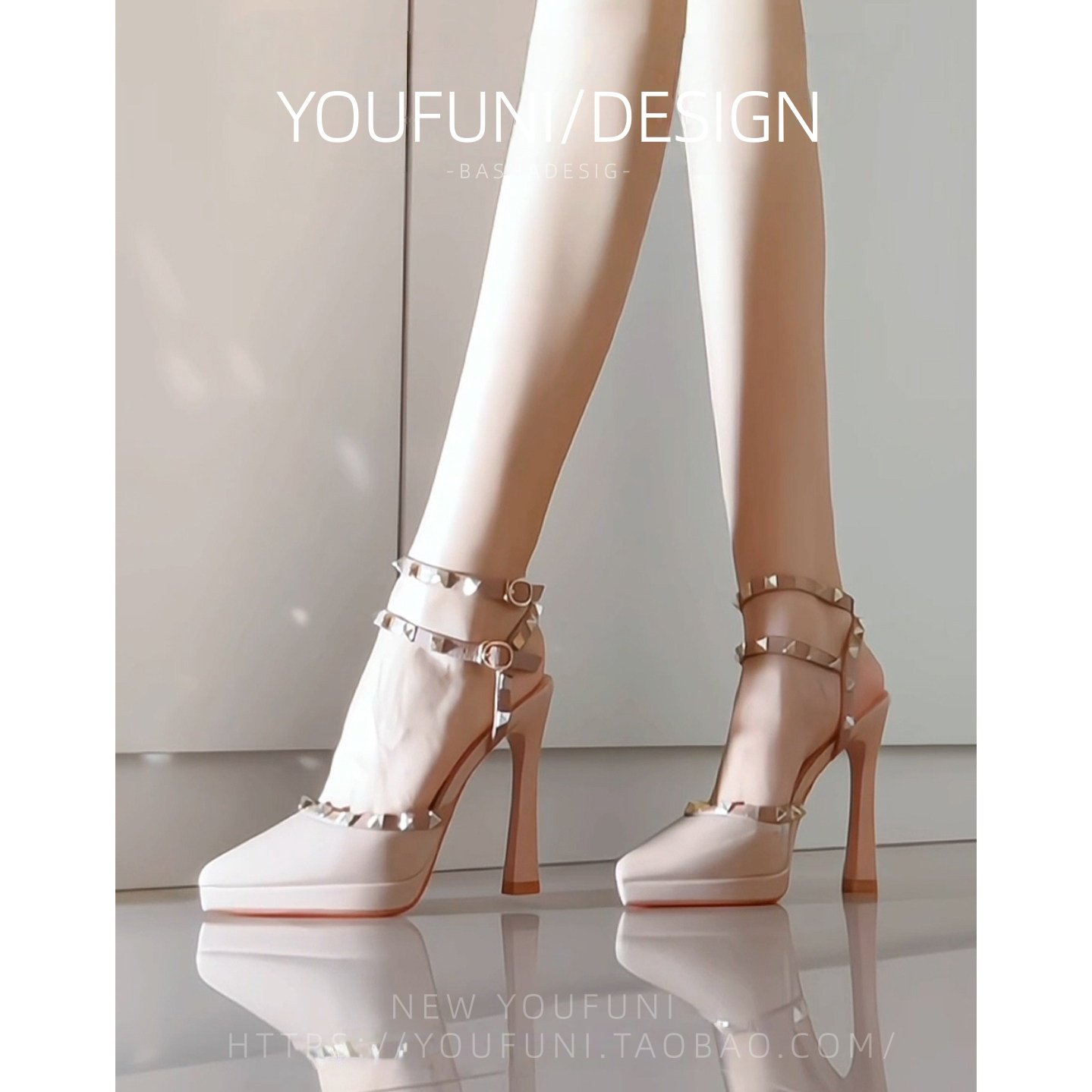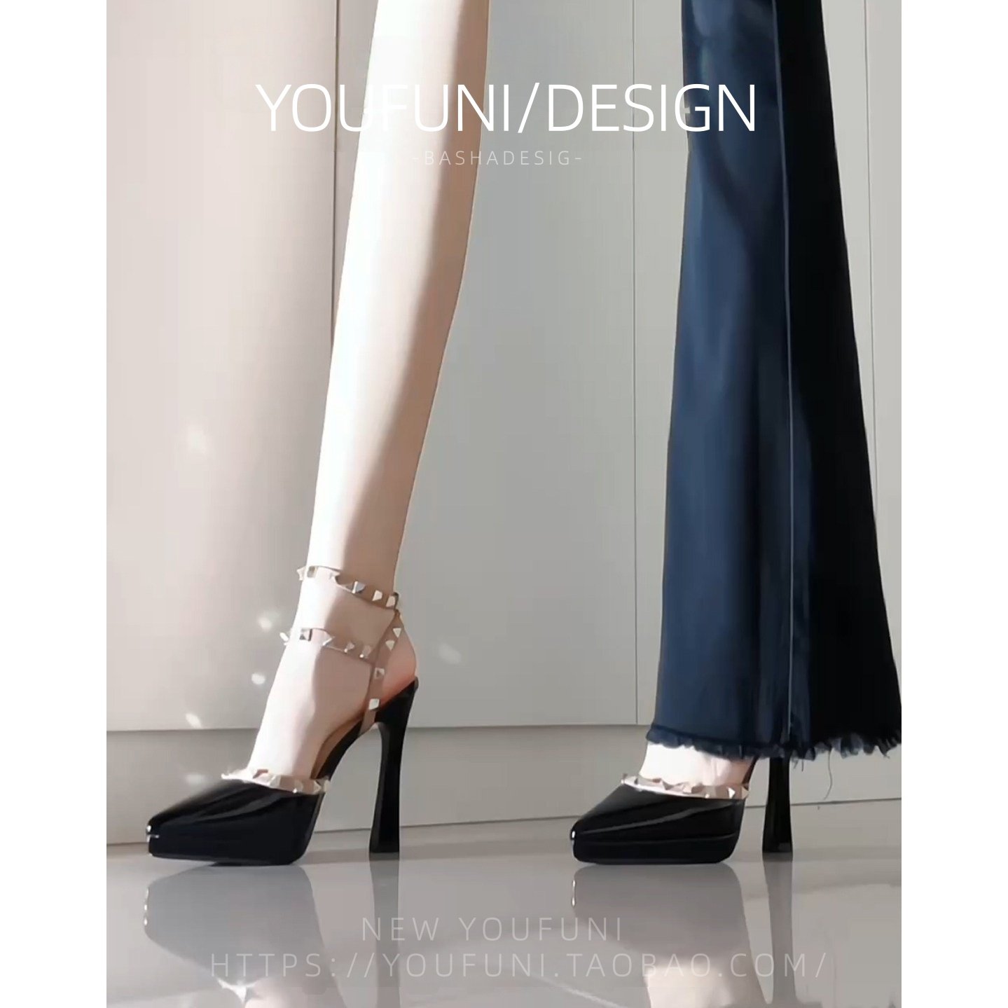 2026新款防水台高跟鞋女细跟性感一字带裸色尖头铆钉漆皮职业单鞋