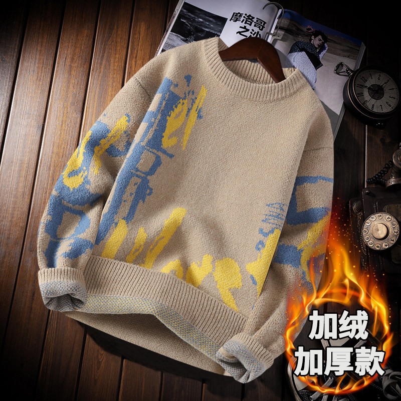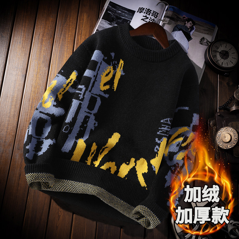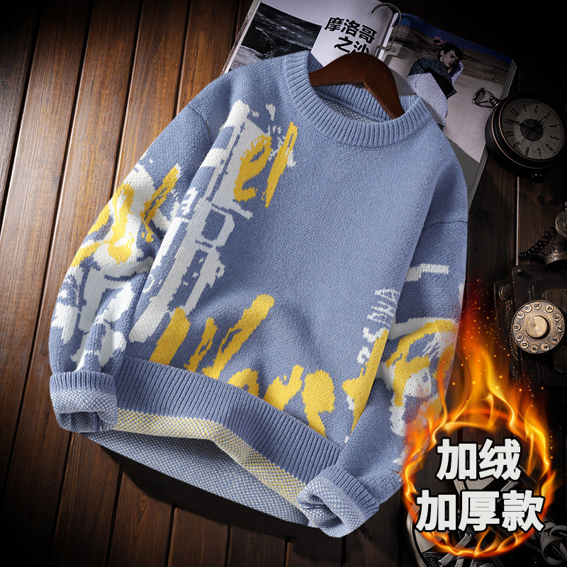 加绒加厚圆领印花毛衣男冬季学生宽松套头毛线衣青少年针织打底衫