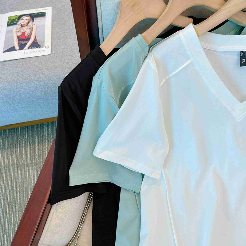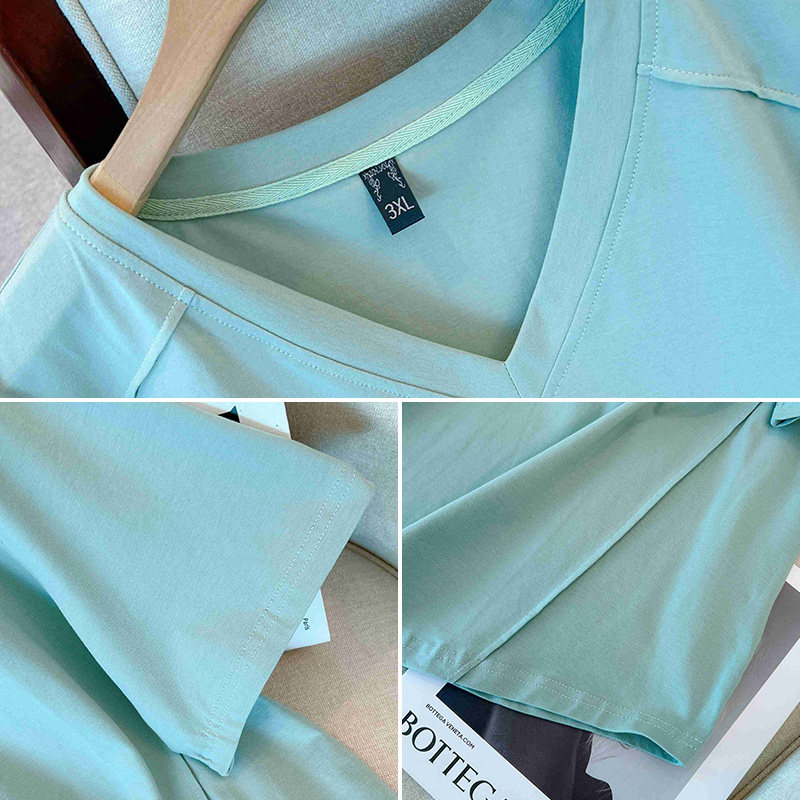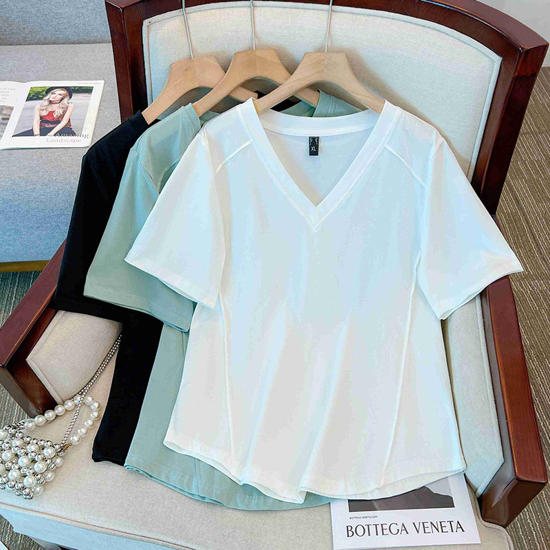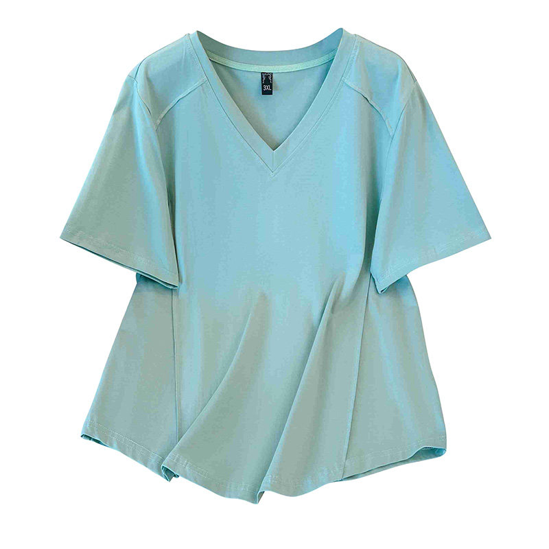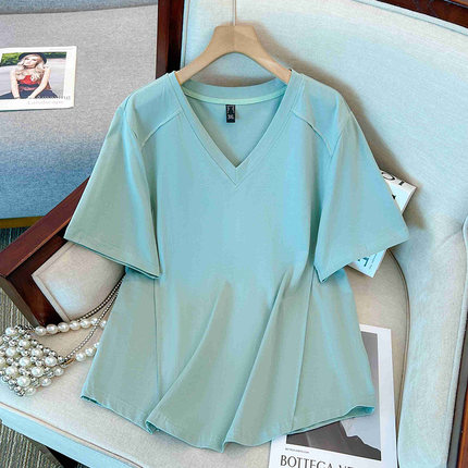 大码女装t恤夏季短袖V领纯棉体恤宽松藏肉遮肚子上衣200斤胖mm潮