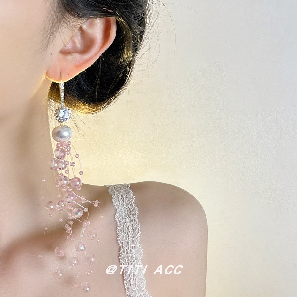 超仙粉色珍珠长款流苏耳环小众高级感满天星耳钉轻奢时尚百搭耳饰