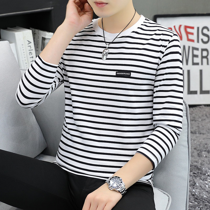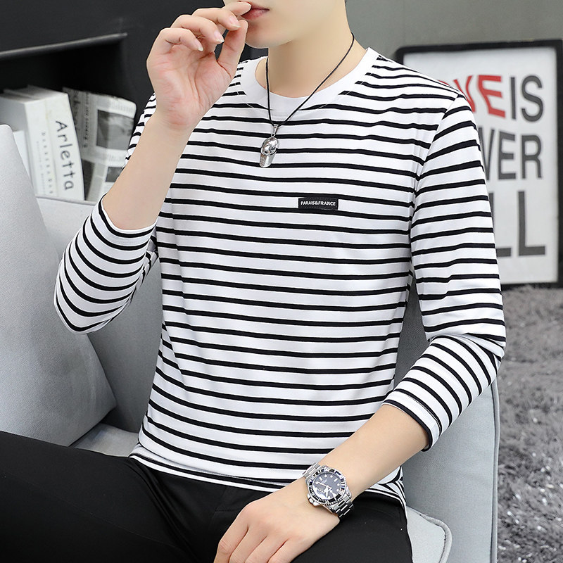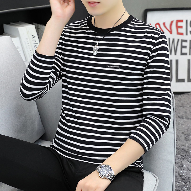 条纹圆领长袖t恤男春秋新款潮流纯棉上衣打底衫印花帅气流行