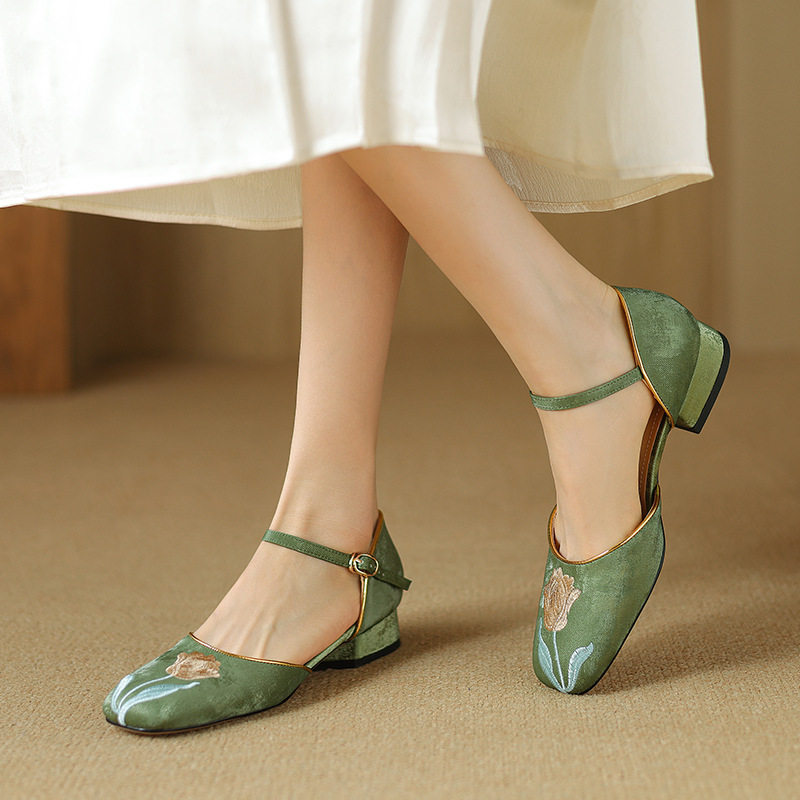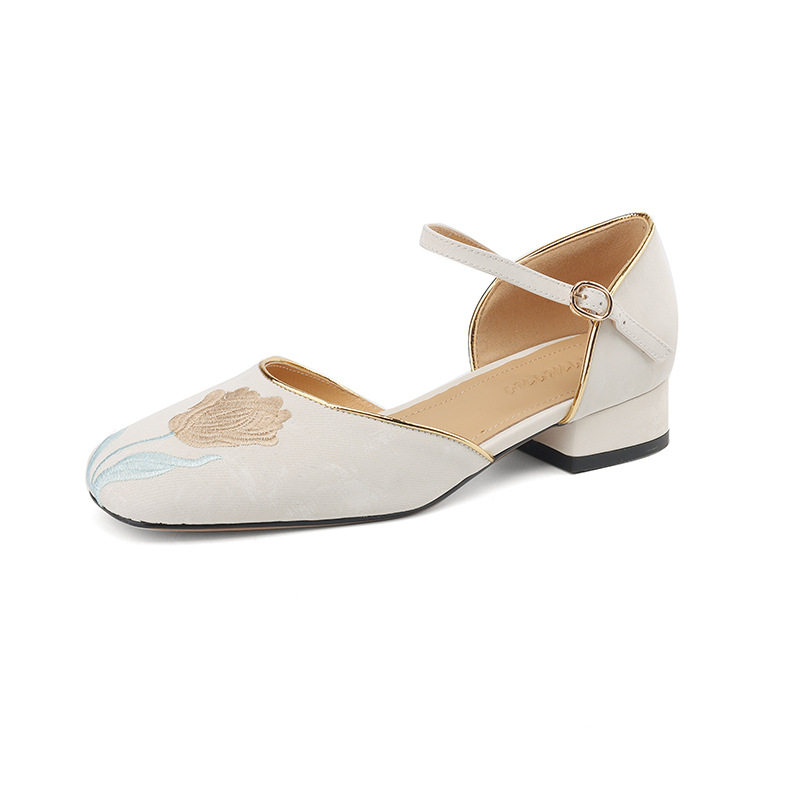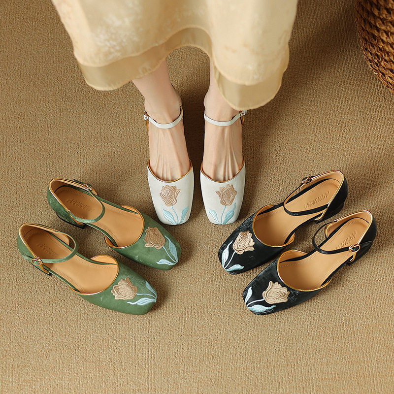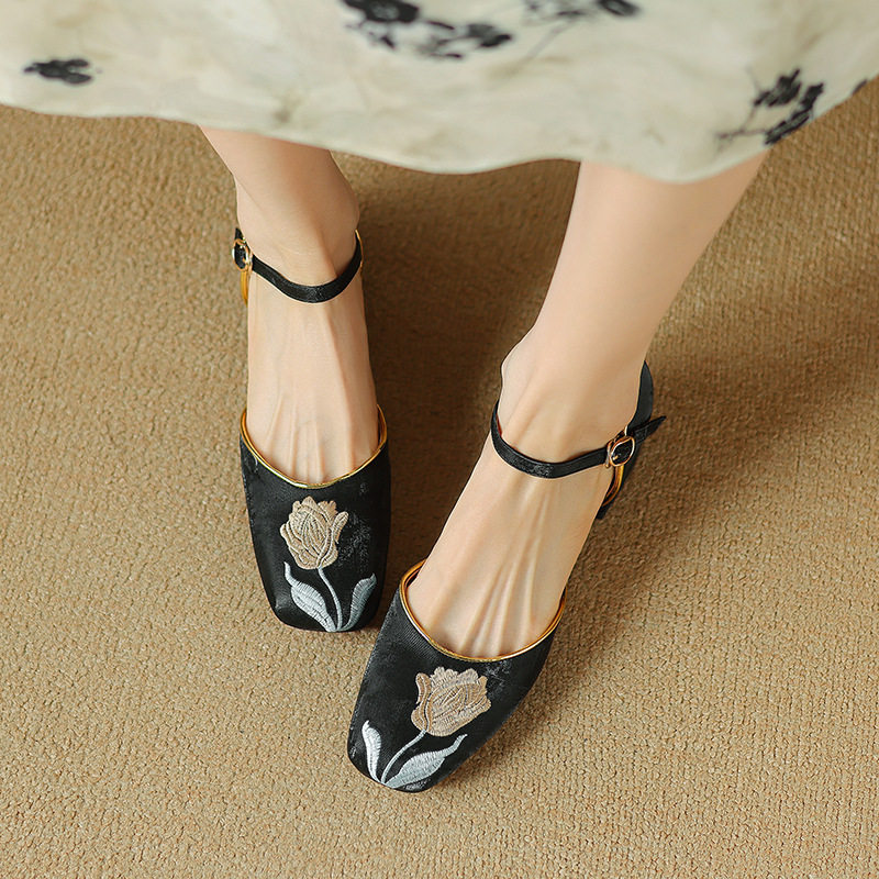 金色玫瑰~方头新国风一字扣包头凉鞋女春夏新款百搭包跟中空单鞋