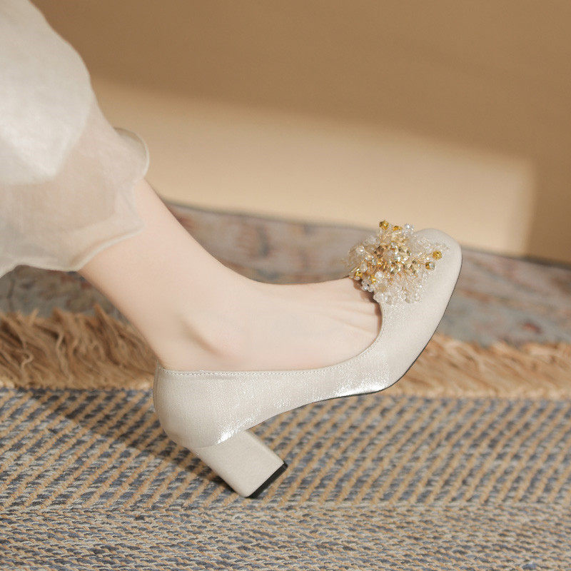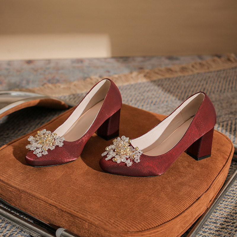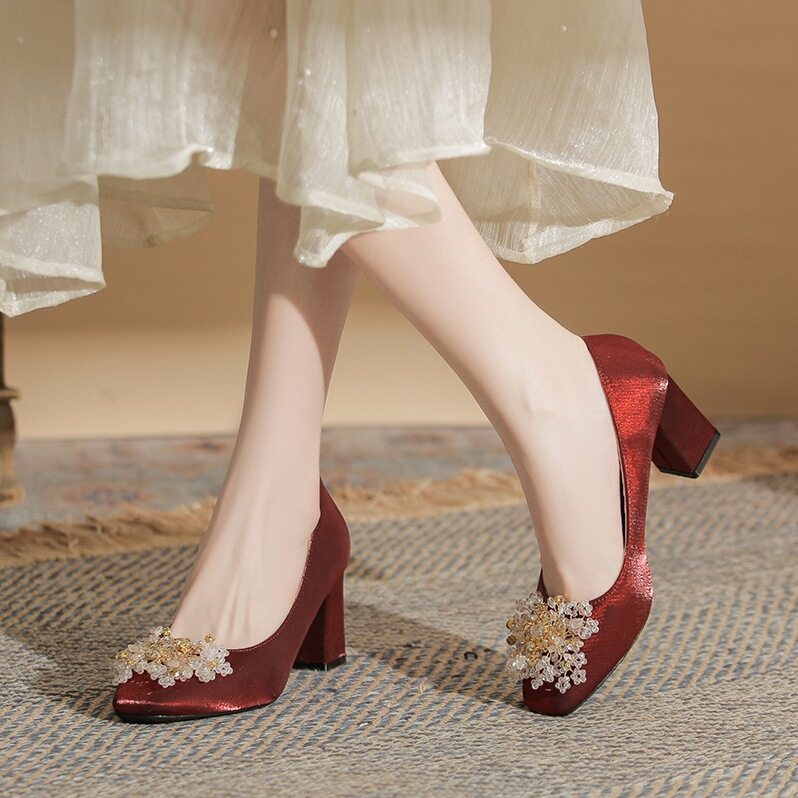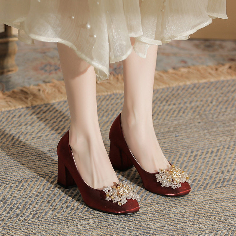 秀禾婚鞋2025新款方头粗跟敬酒礼服新娘鞋秀禾服酒红色高跟鞋大码