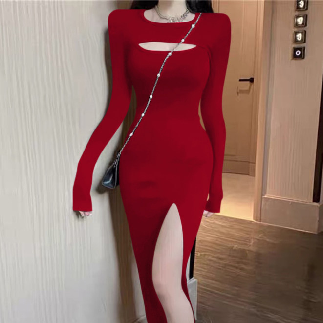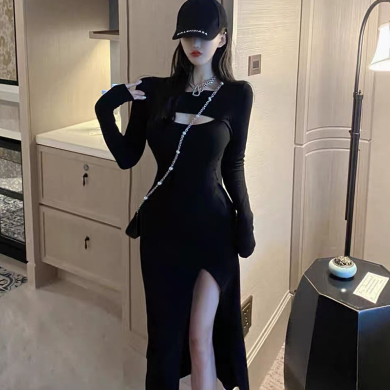 2023秋冬内搭性感镂空连衣裙女高开叉中长款修身打底裙气质长裙子