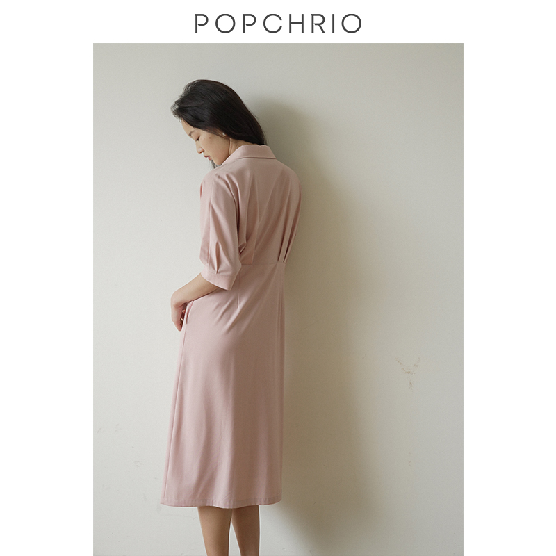 【到手199元】法式V领翻领五分袖高腰衬衫裙气质收腰裙子中长款女