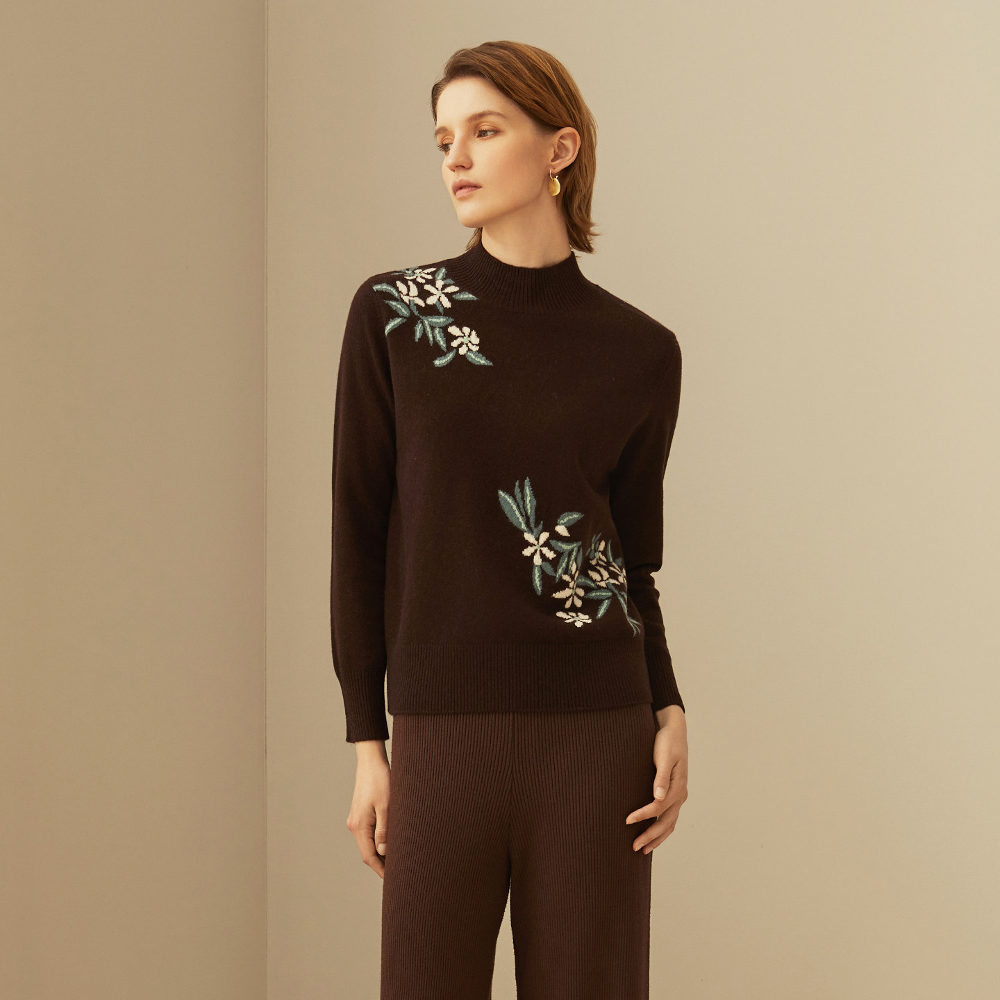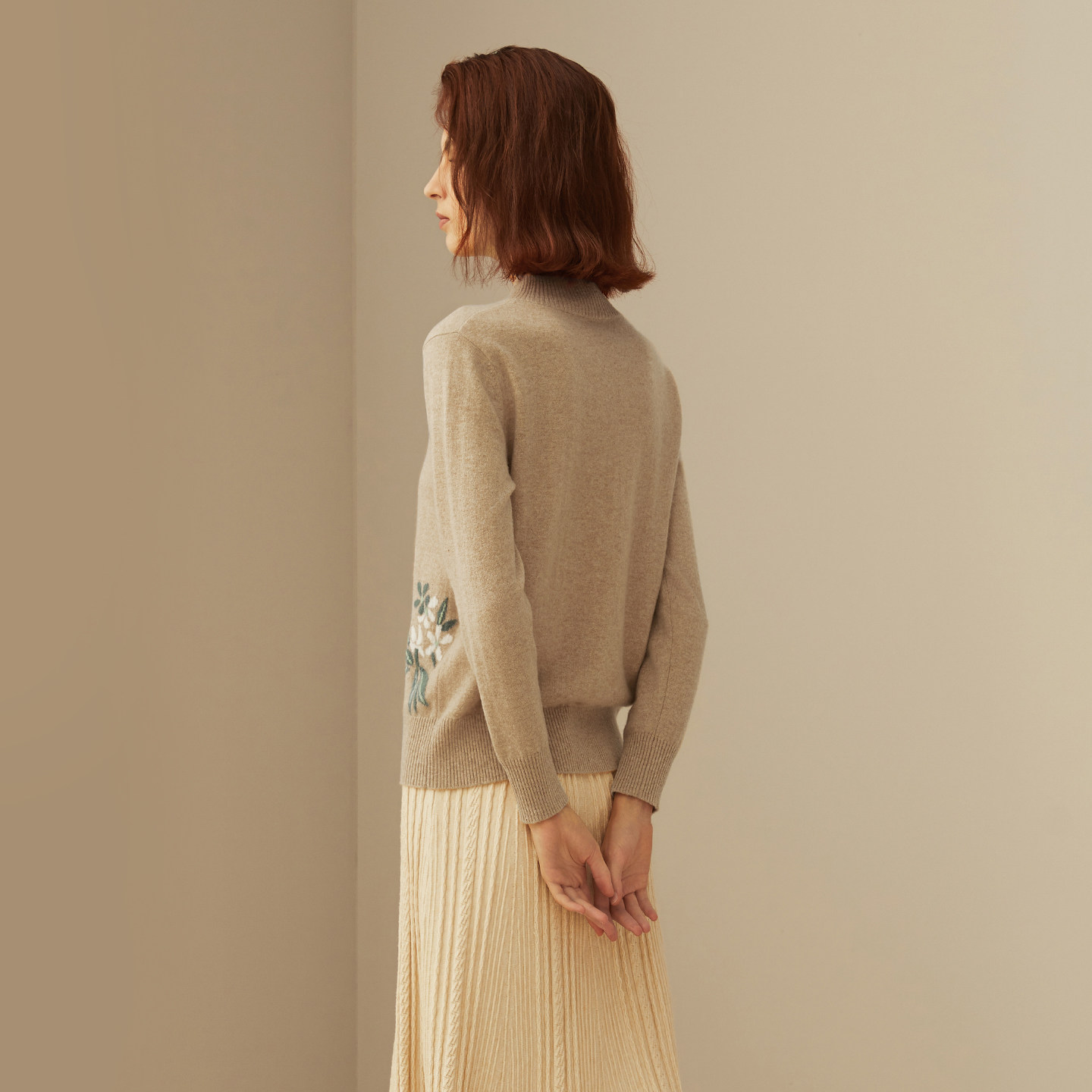 鹿王100%纯山羊绒衫女士半高领针织绣花保暖打底毛衣套衫秋冬新款
