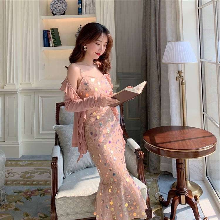 性感亮片吊带连衣裙两件套仙女裙子夏修身显瘦荷叶边鱼尾长裙套装