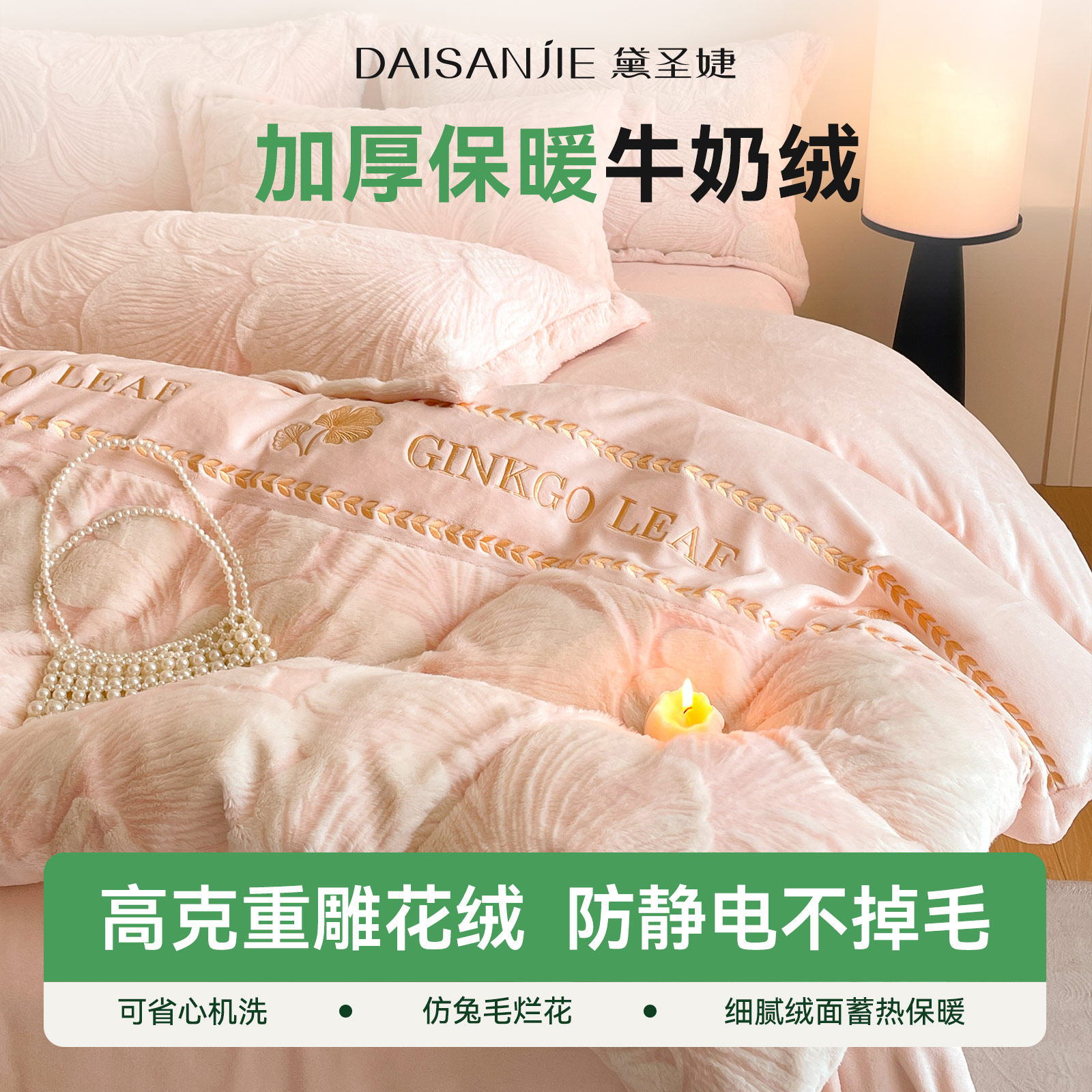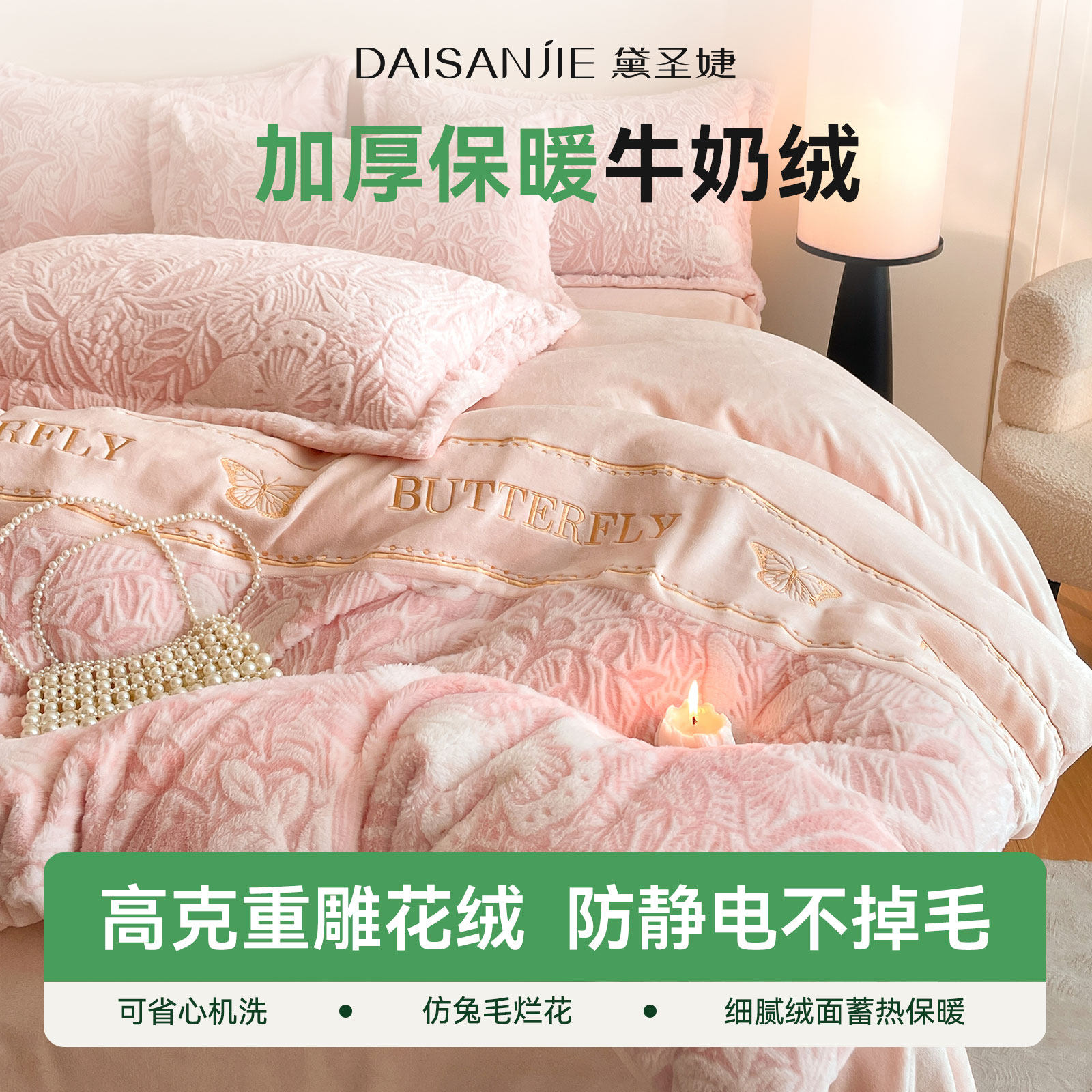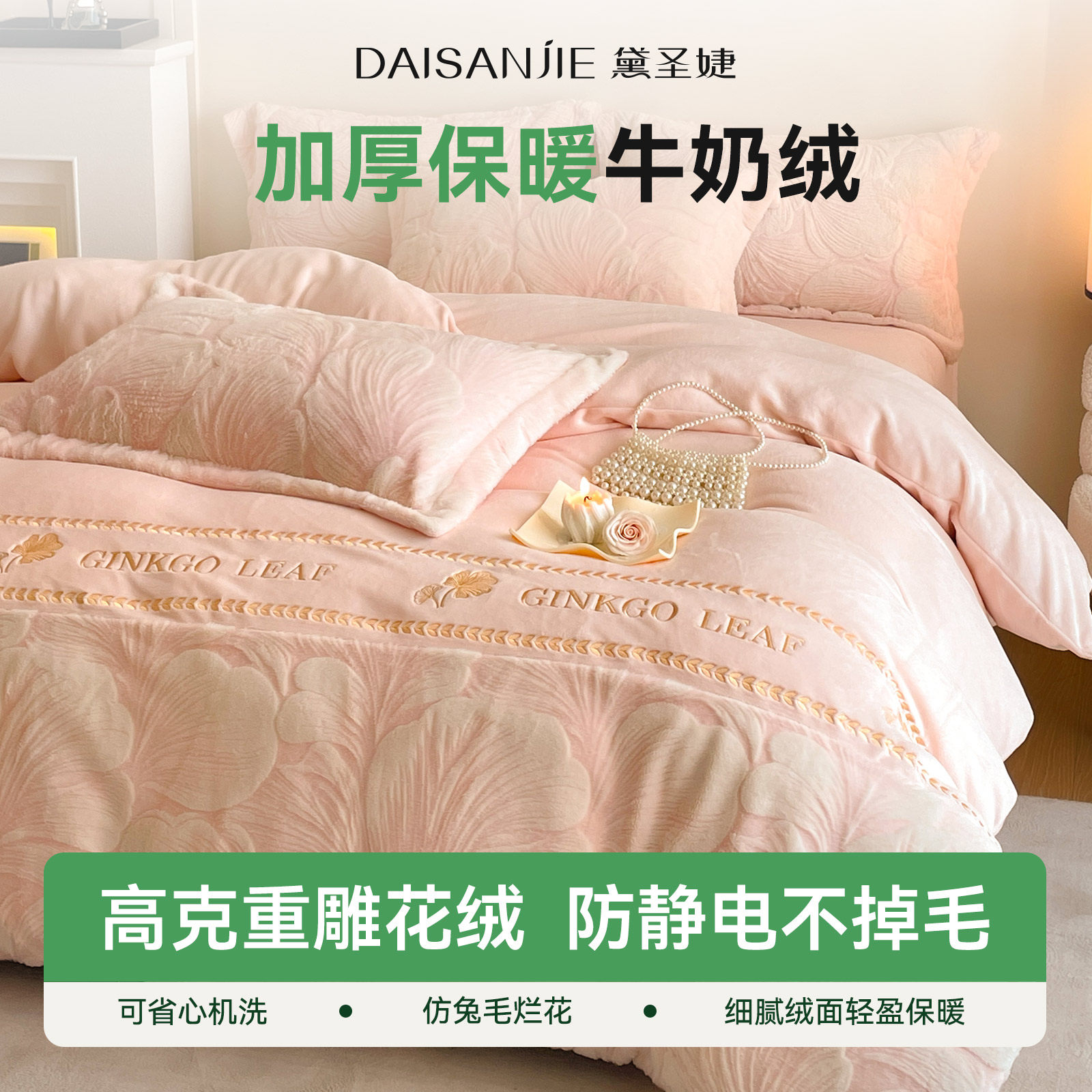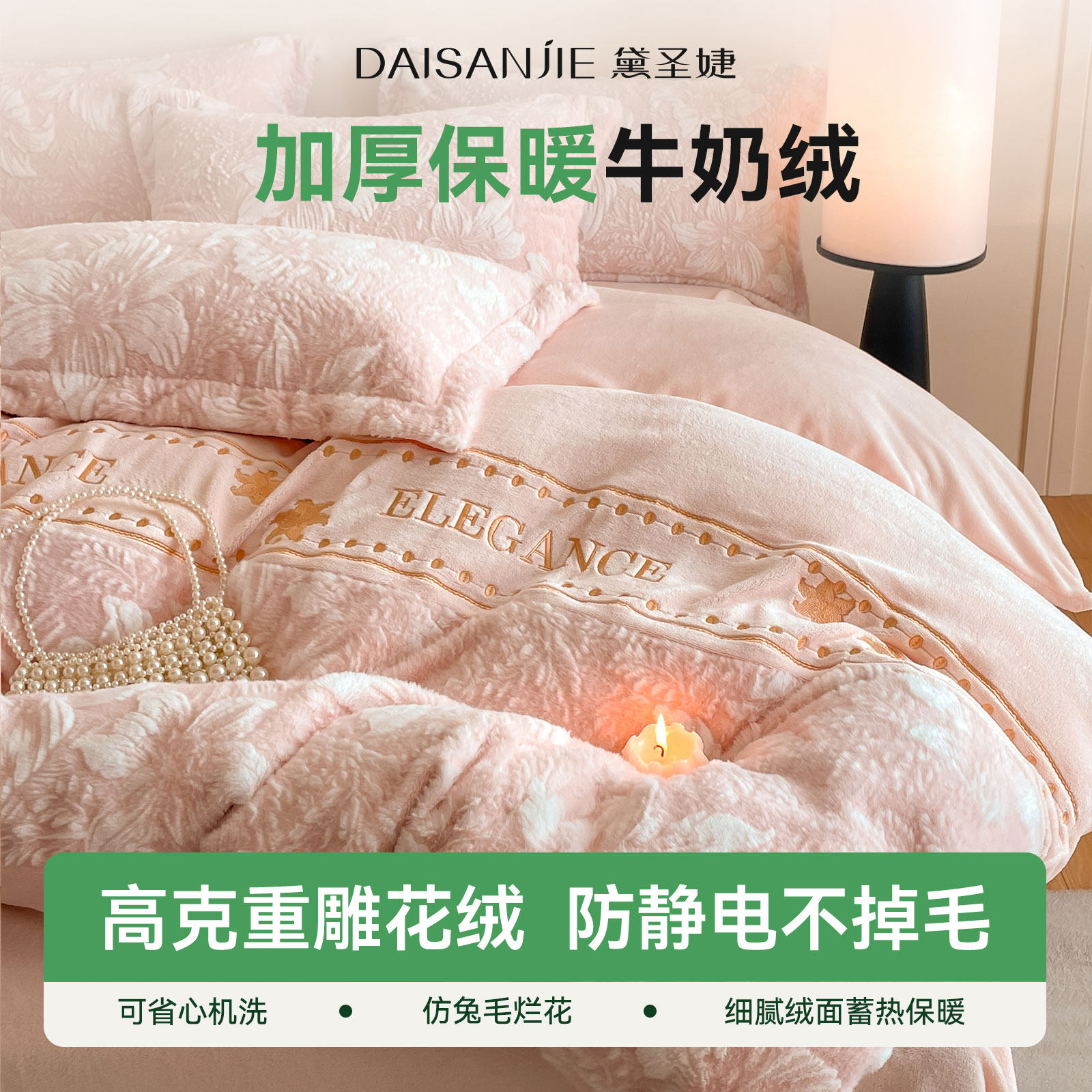 冬季加厚雕花牛奶绒四件套2025新款加绒珊瑚绒被套床单床品三件套