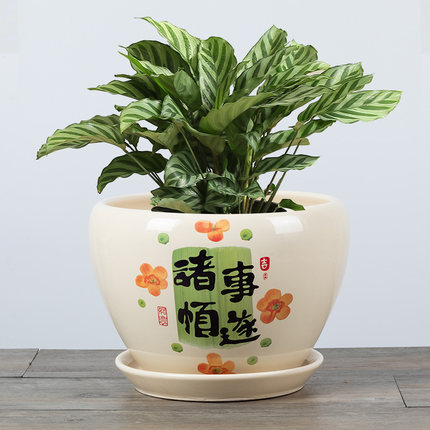 中国风家用陶瓷花盆喜乐八方来财桌面盆栽蝴蝶兰花多肉大花盆带托