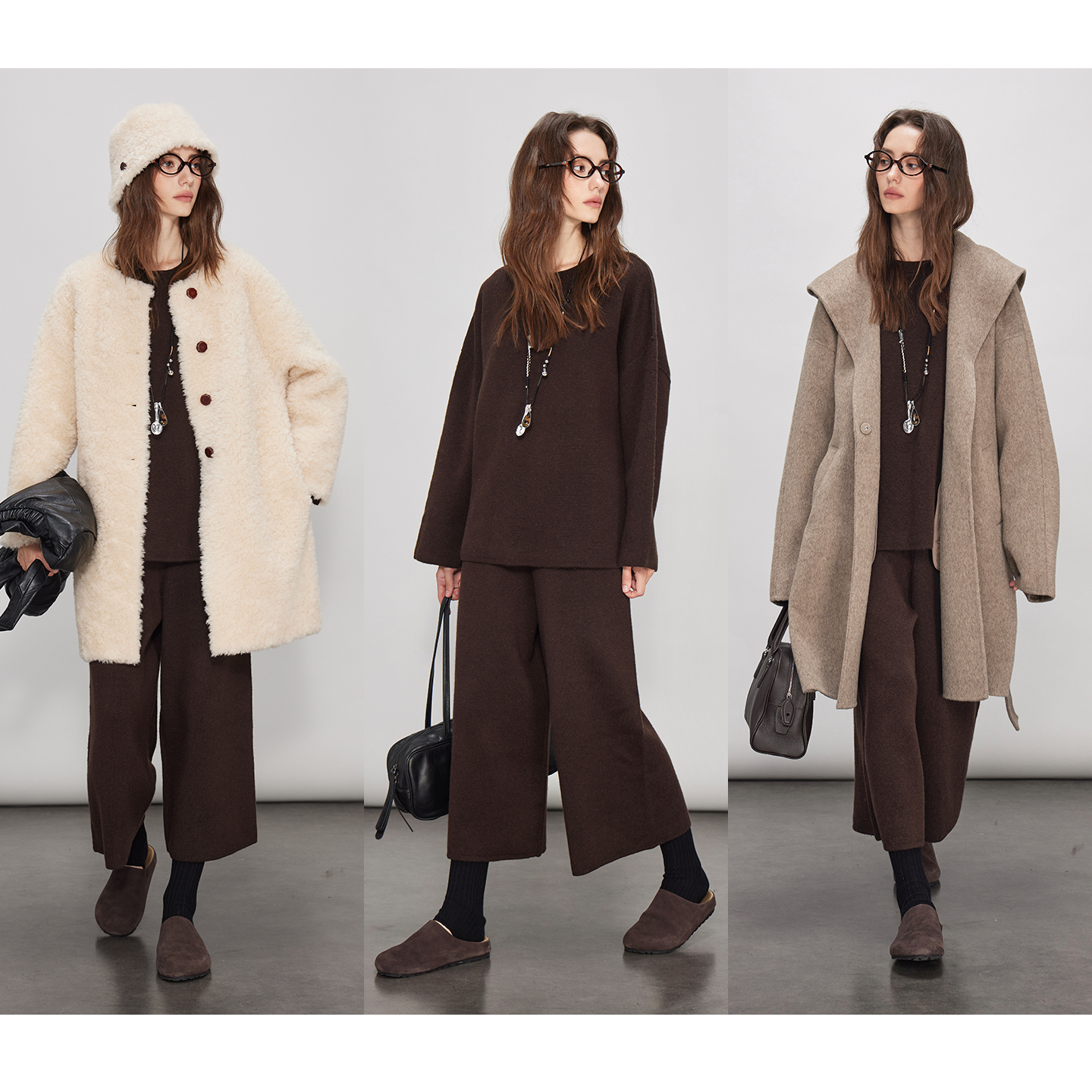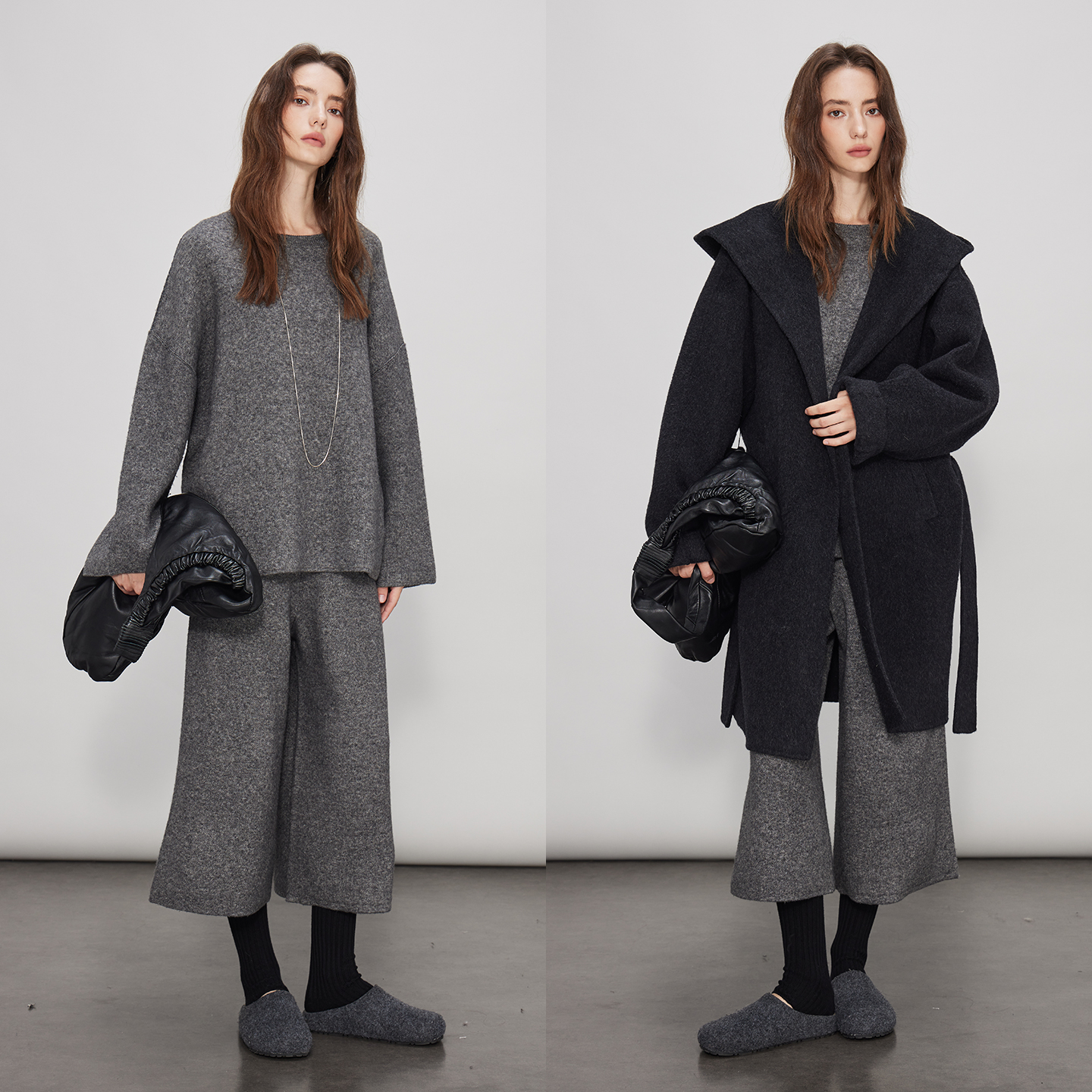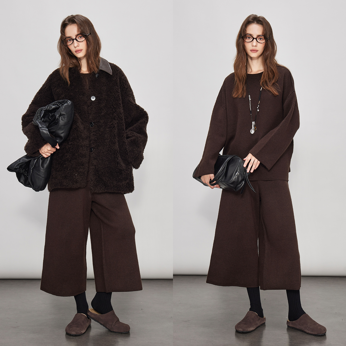 3ONE简约高级感双面高密针织圆领套头100毛衣/九分针织羊毛裤套装