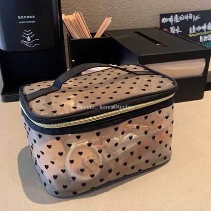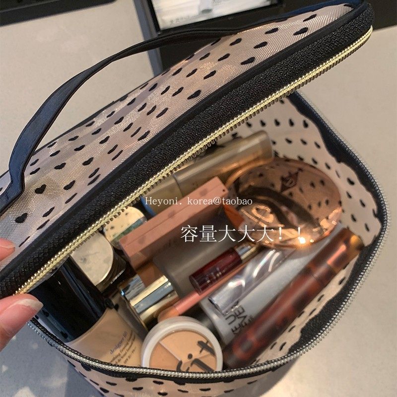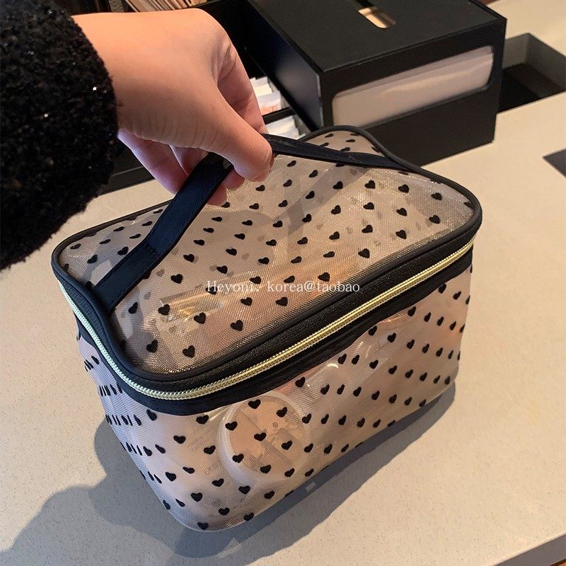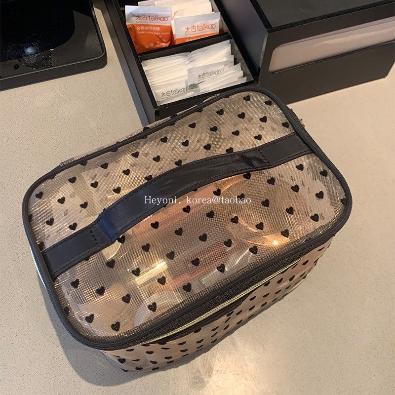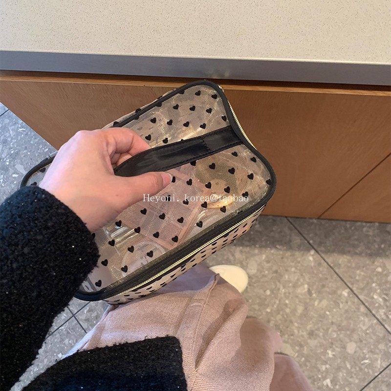 HEYONI韩国高级爱心植绒化妆包大容量网纱收纳洗漱包旅行便携手提