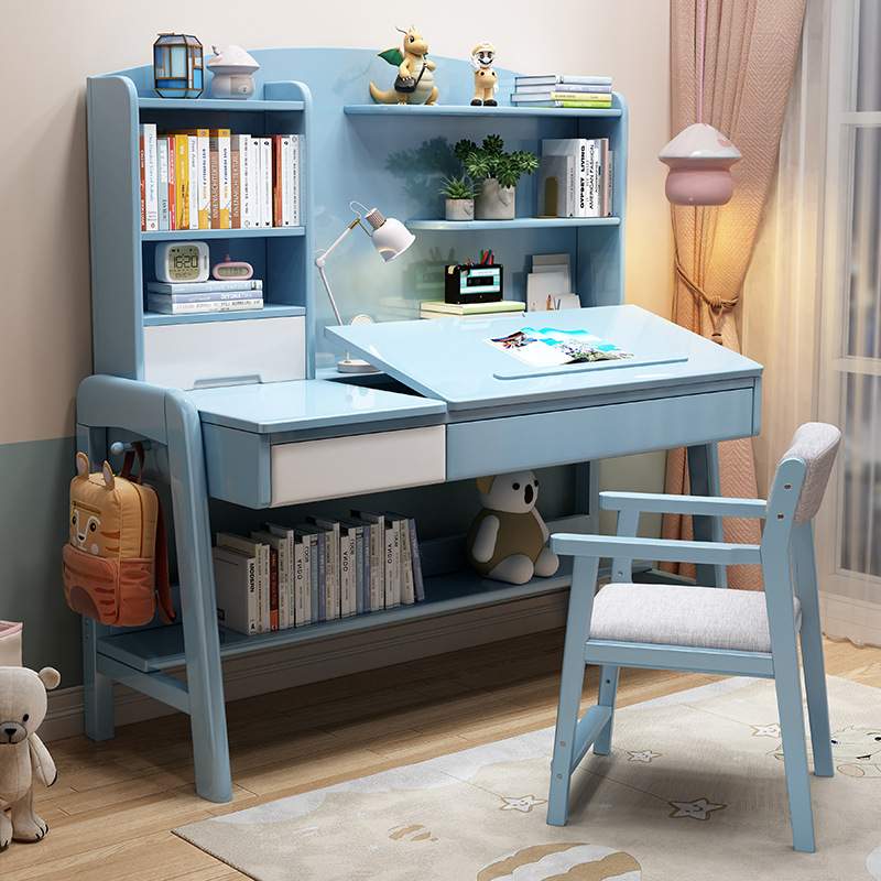 实木书桌桌面可调节卧室男孩学生学习写字桌蓝色儿童升降桌椅套装