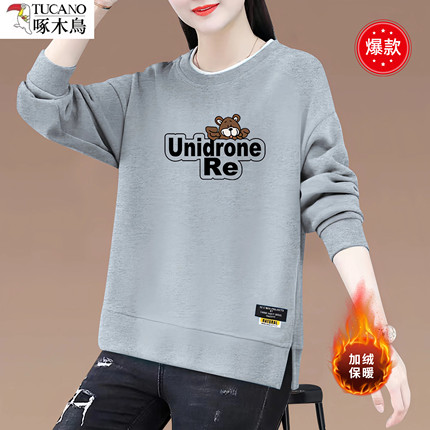 啄木鸟纯棉圆领加绒加厚长袖卫衣女2025冬季新款宽松显瘦妈妈女装