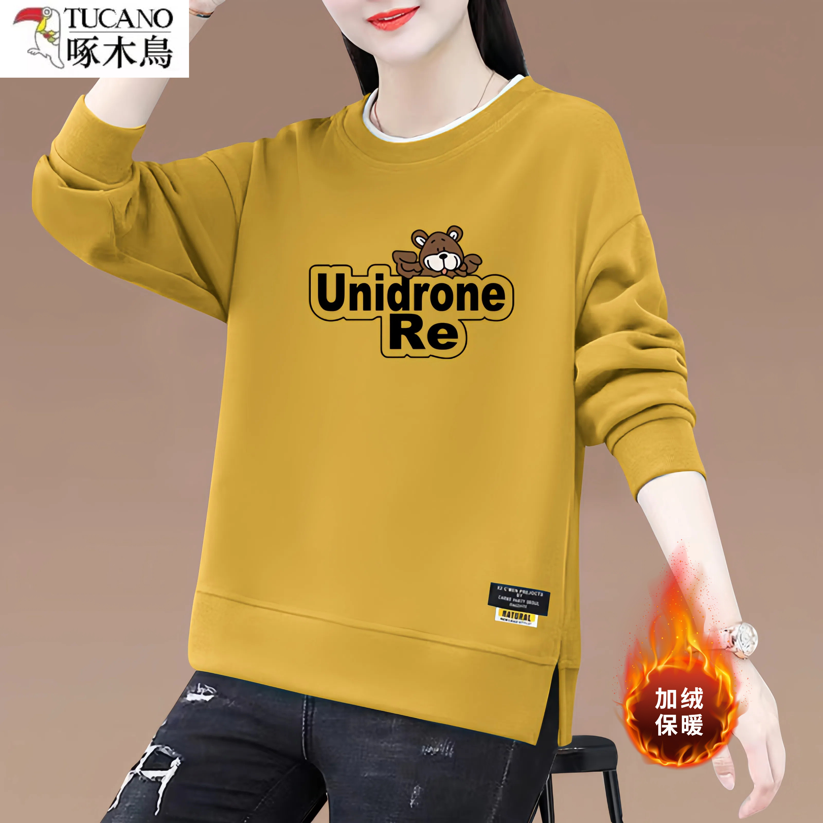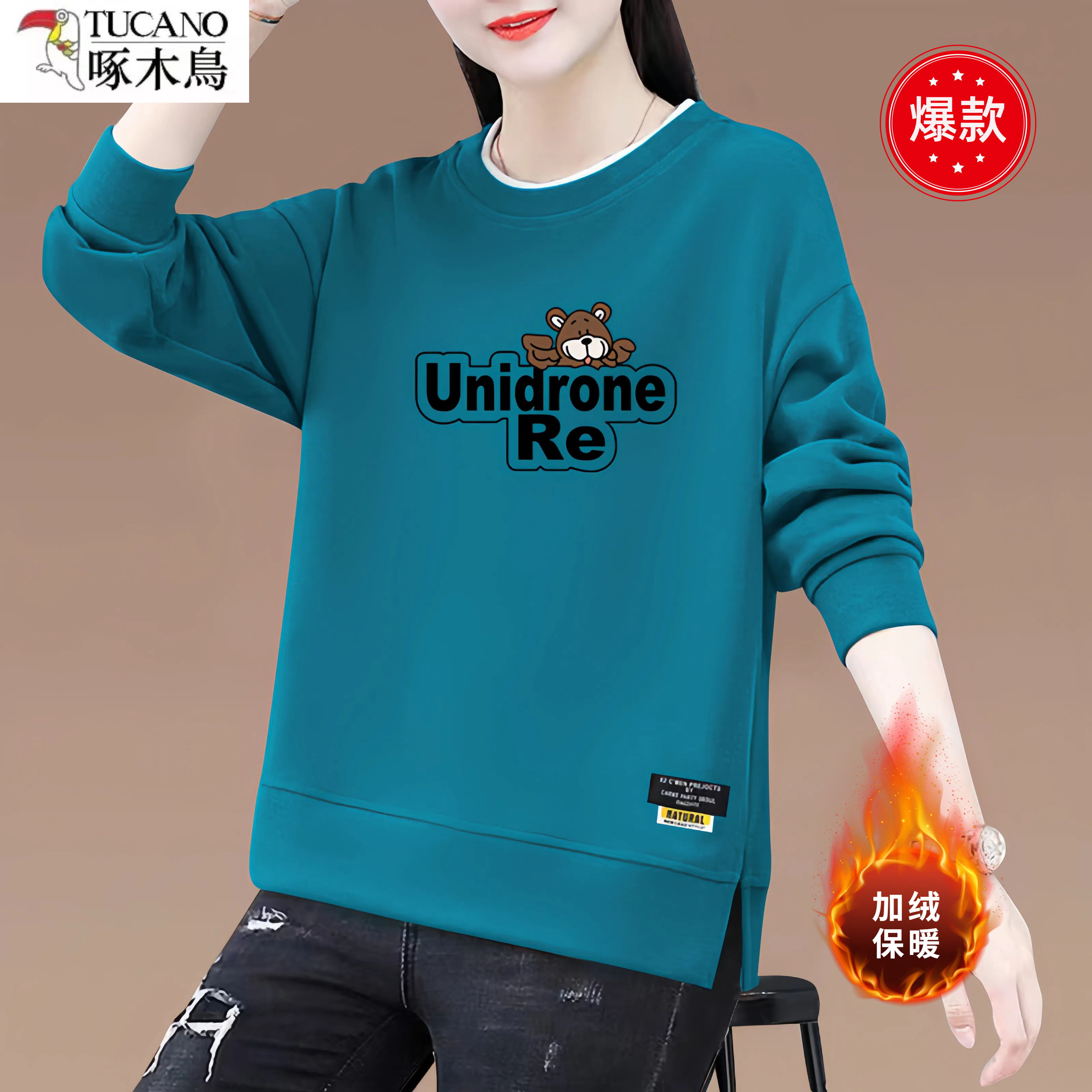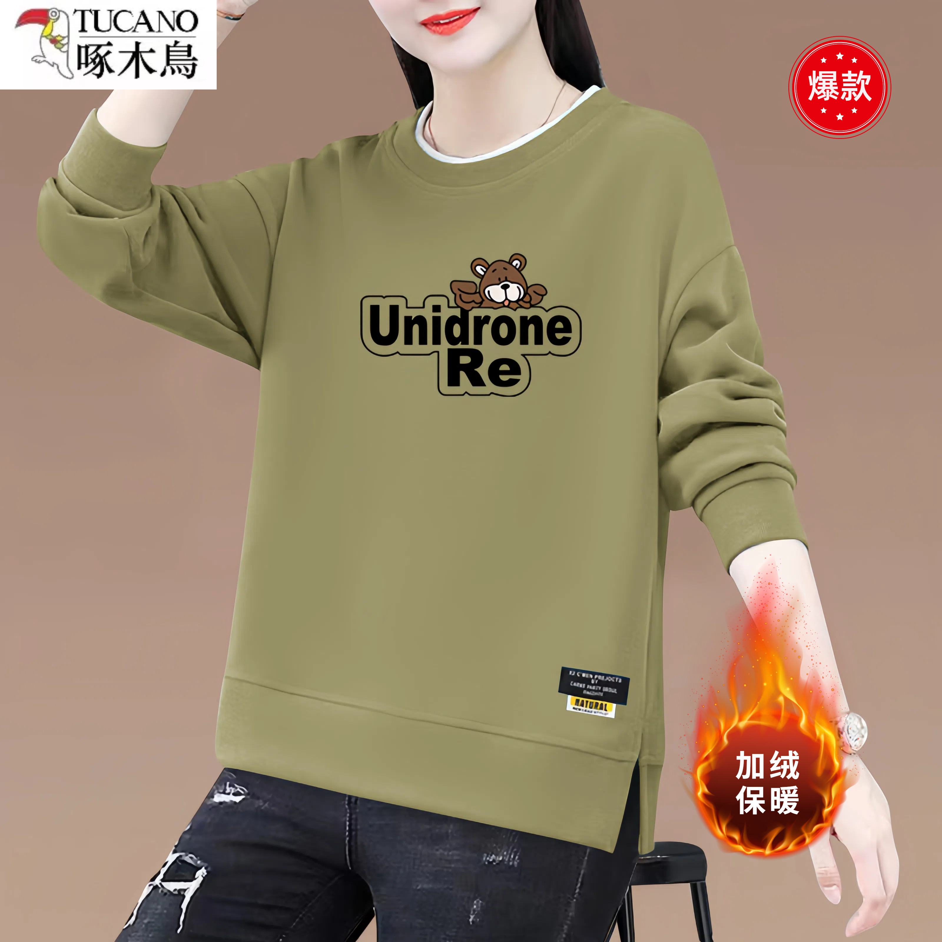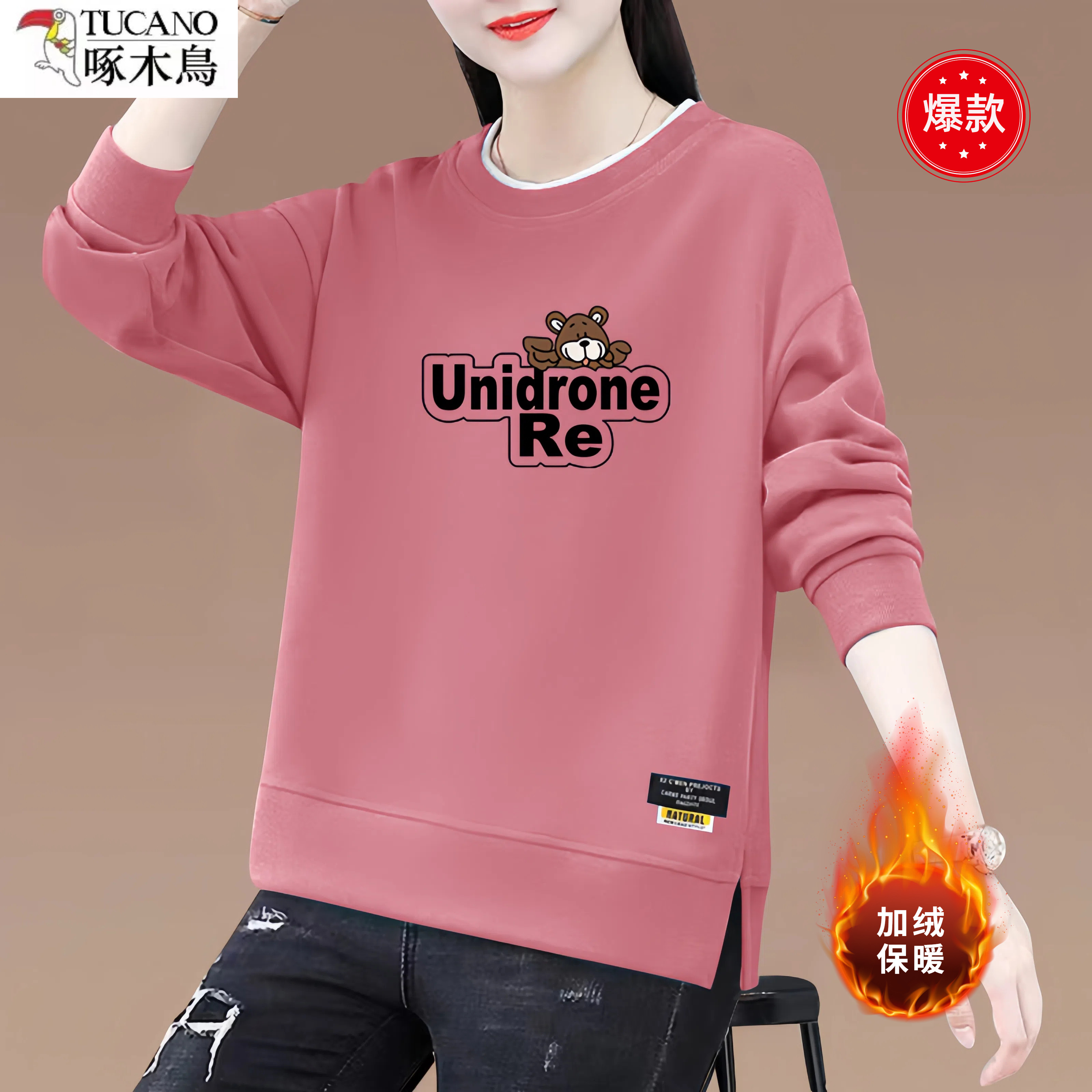 啄木鸟纯棉圆领加绒加厚长袖卫衣