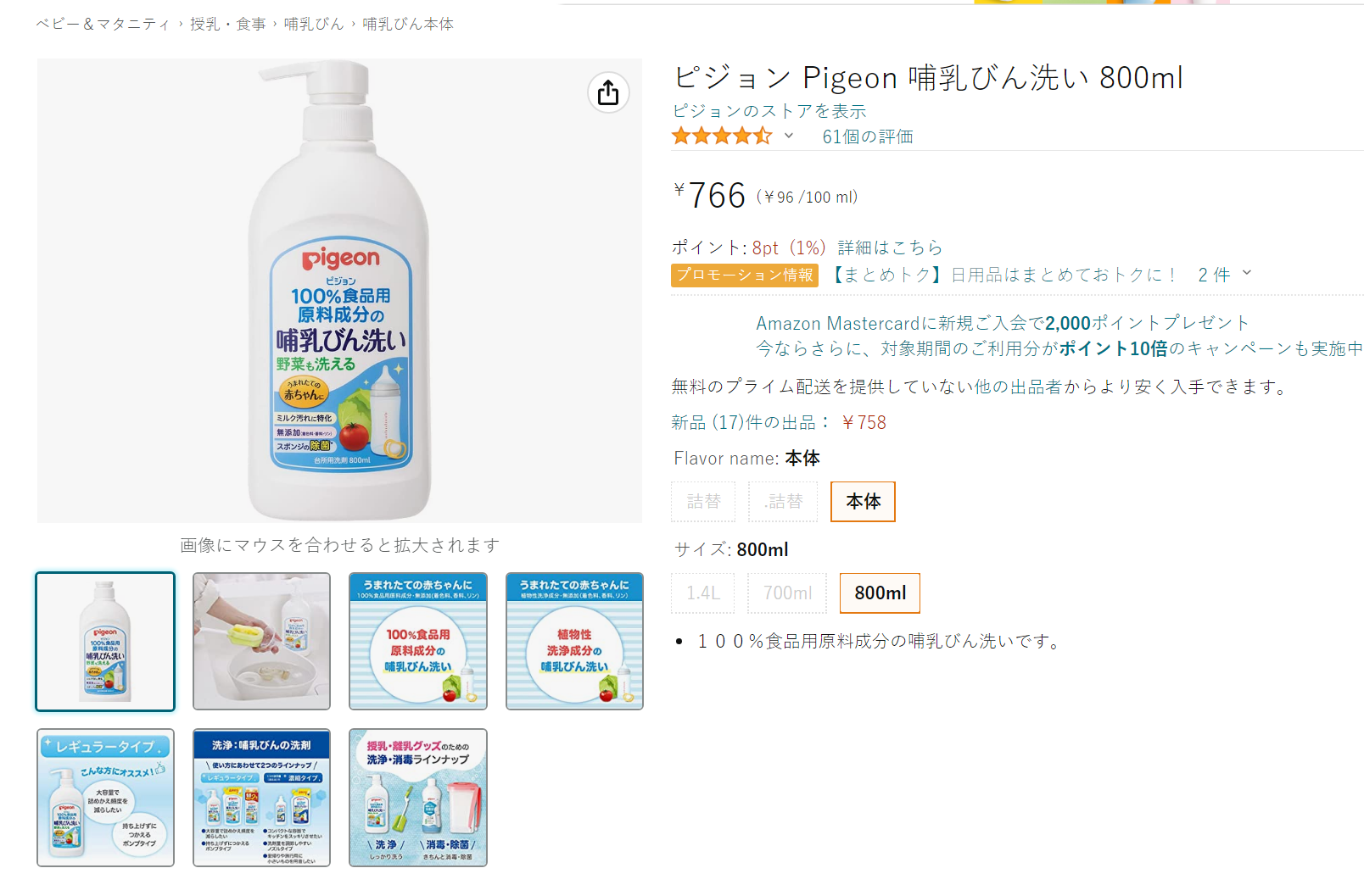 新到货 日本本土Pigeon贝亲奶瓶蔬菜水果蔬餐具玩具清洁液800ml
