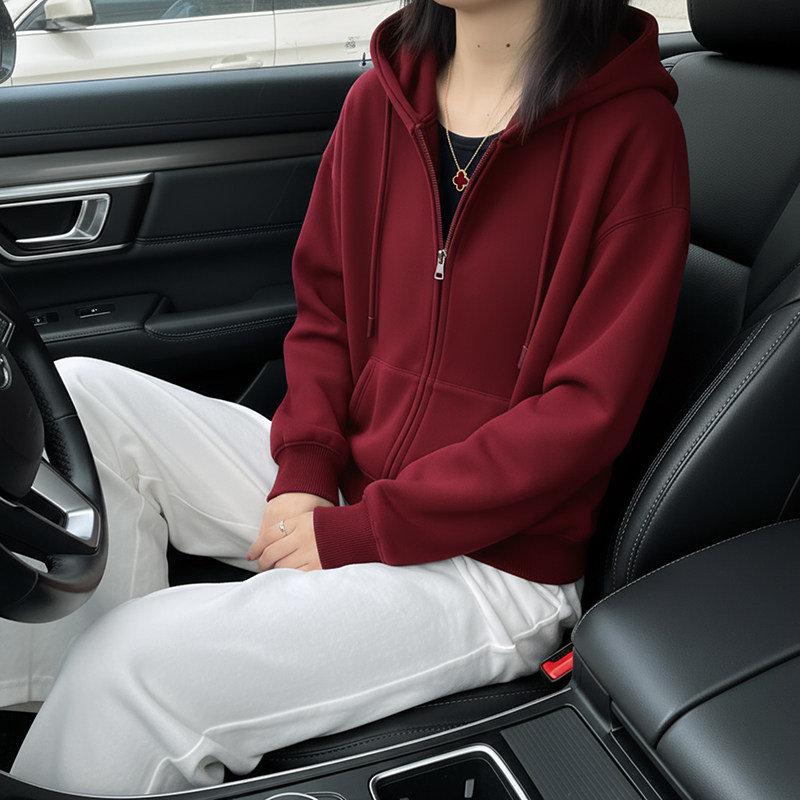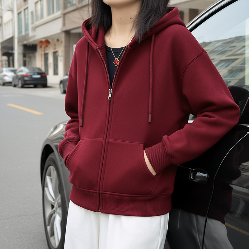 开衫外套拉链连帽加绒卫衣女款2025新款宽松慵懒风大码红色上衣女