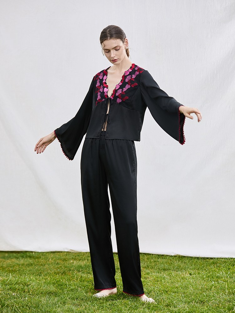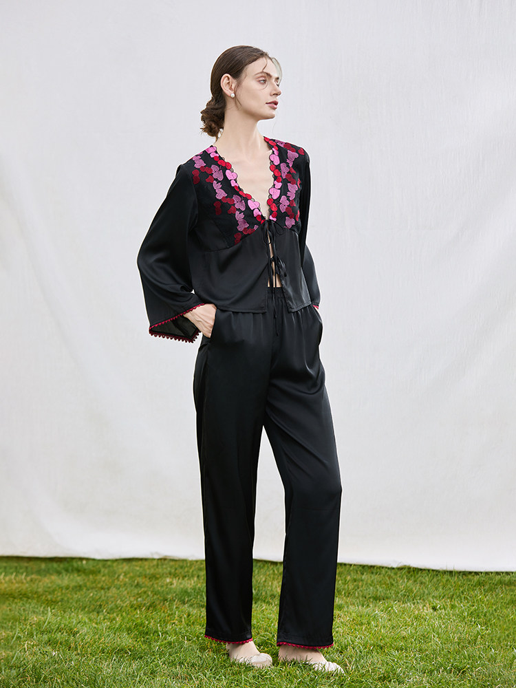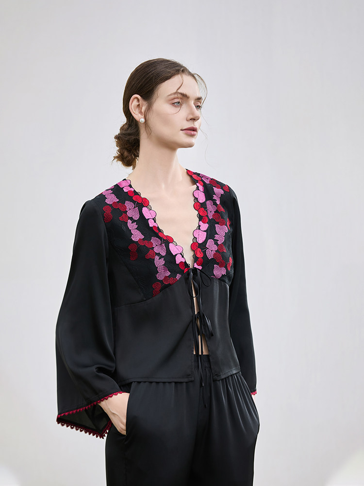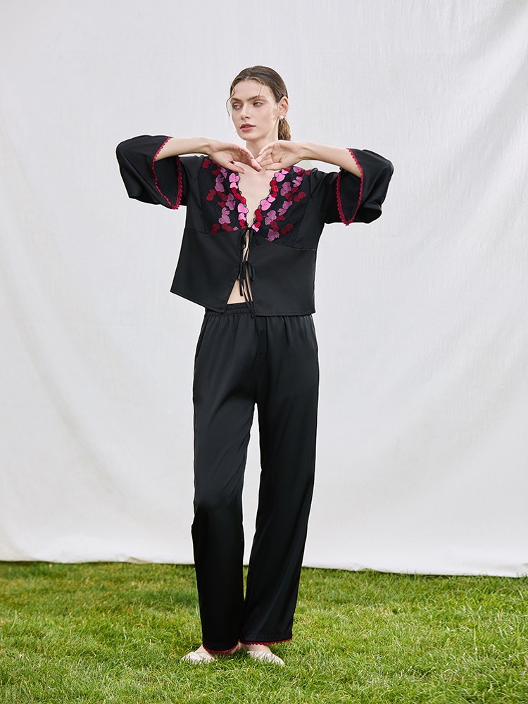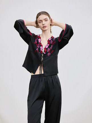 NoirTease春夏薄款丝质睡衣女士性感蕾丝绣花系带家居服两件套装