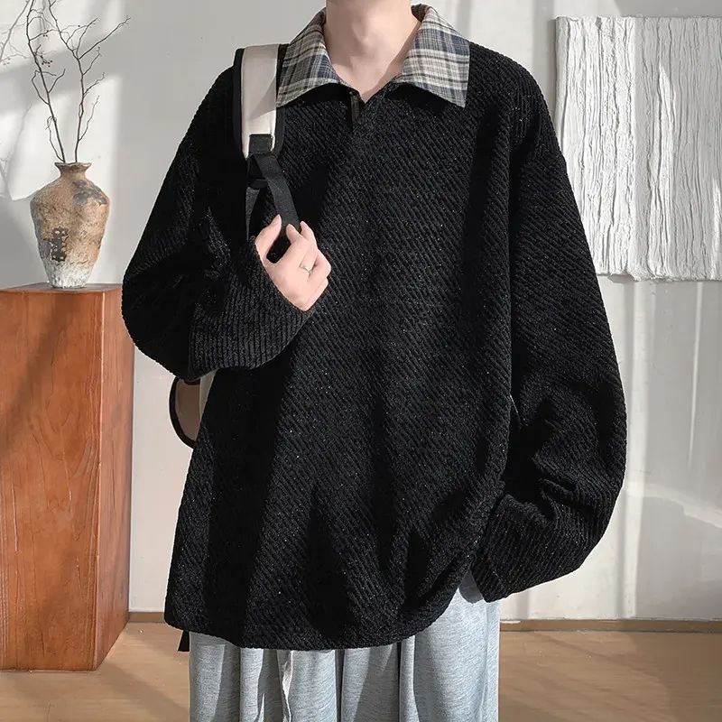 格子斑马纹polo衫男春秋潮牌美式重磅衣服宽松青少年翻领长袖t恤