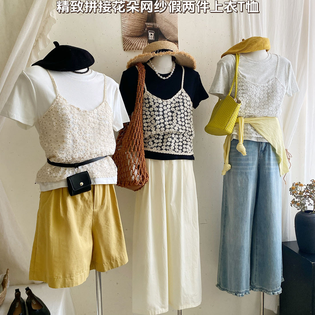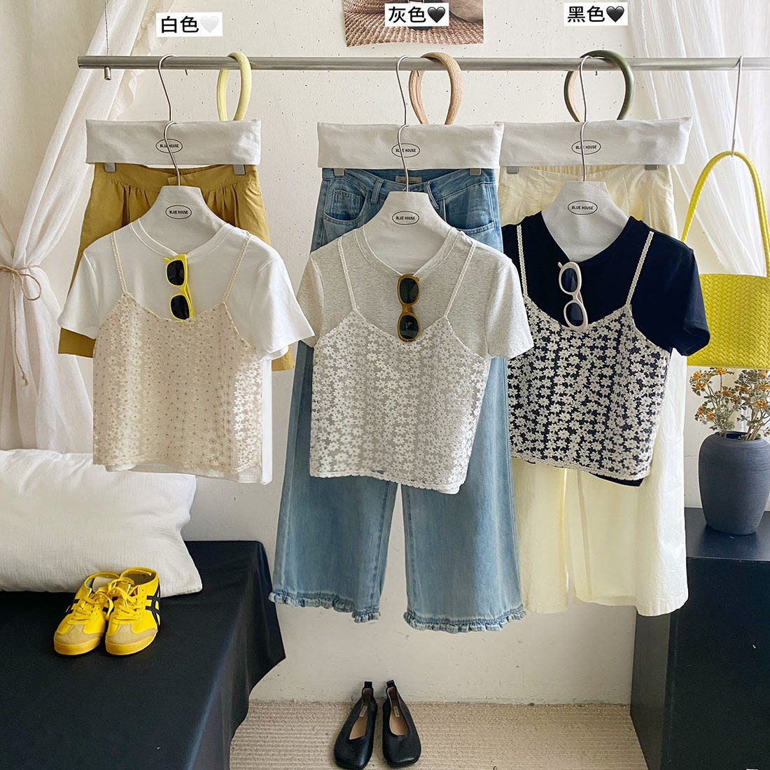 温柔小碎花刺绣蕾丝吊带拼接假两件短袖t恤女夏百搭绝美别致上衣