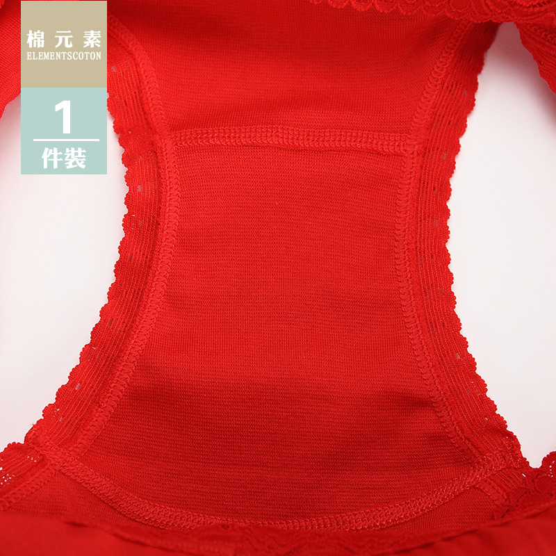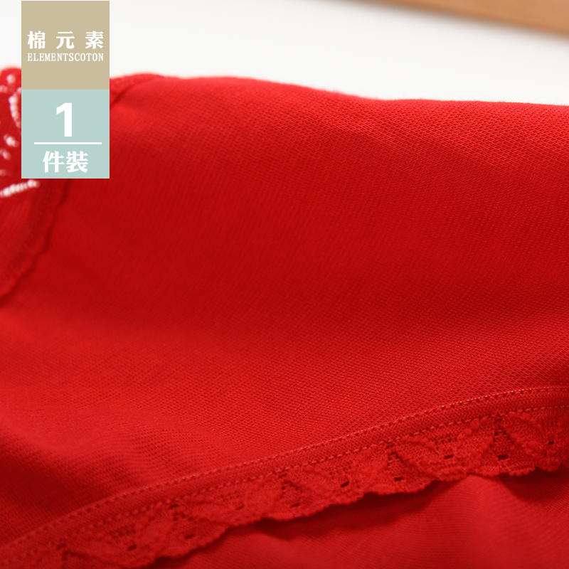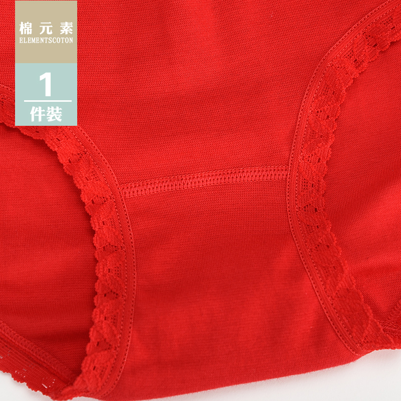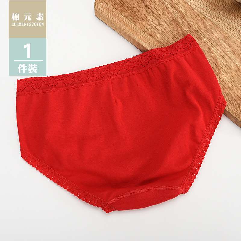 棉元素女士喜庆中高腰弹力棉女生三角内裤蕾丝棉纯色大红色E309-C