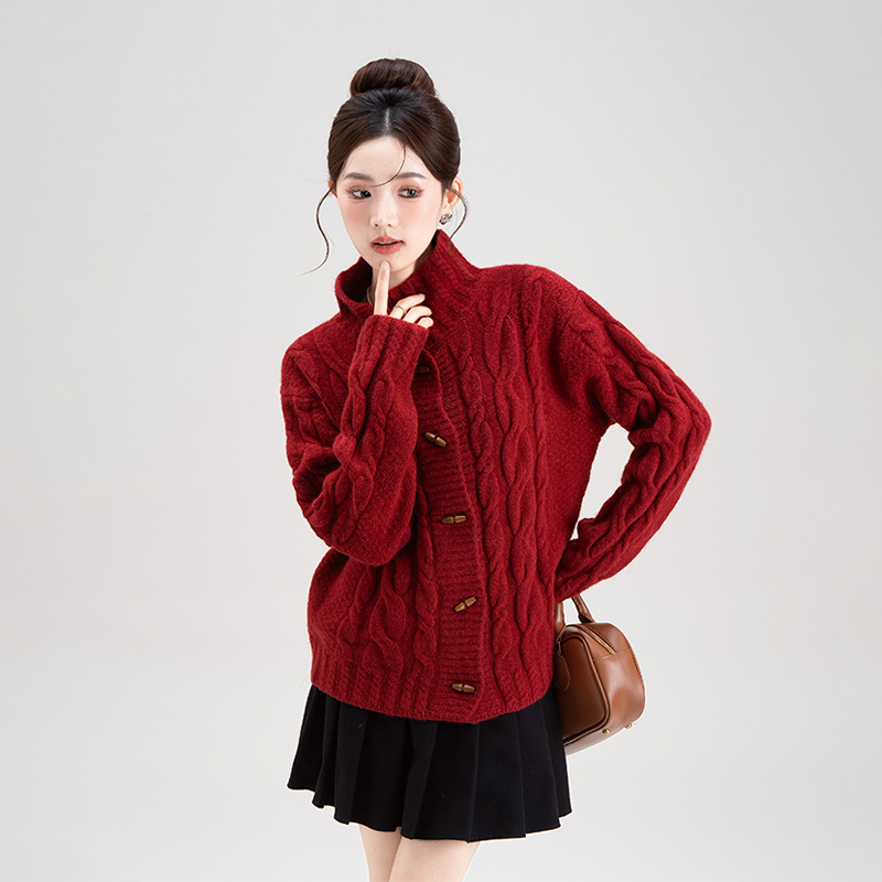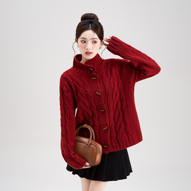 超好看红色麻花牛角扣毛衣开衫女