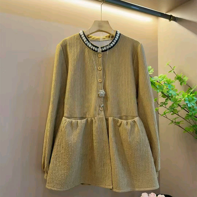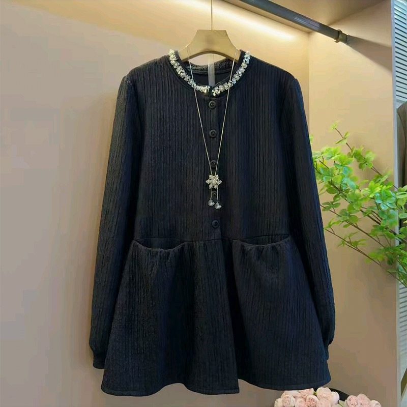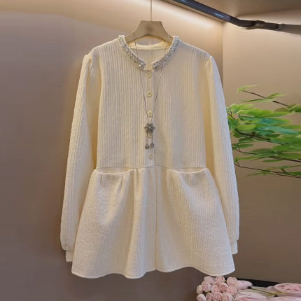 秋季新款欧货重工钉珠圆领上衣胖妹妹大码女装洋气遮肉显瘦衬衫潮