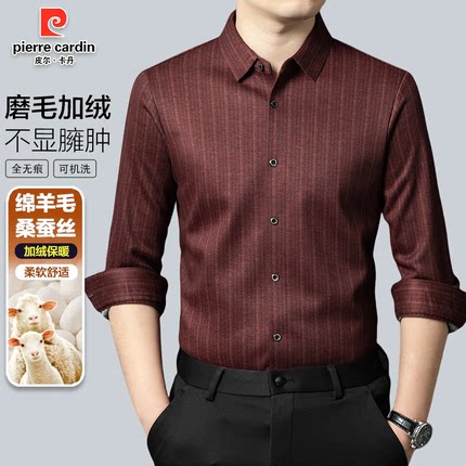 皮尔卡丹绵羊毛桑蚕丝男士磨毛加绒保暖舒适商务休闲印花长袖衬衫