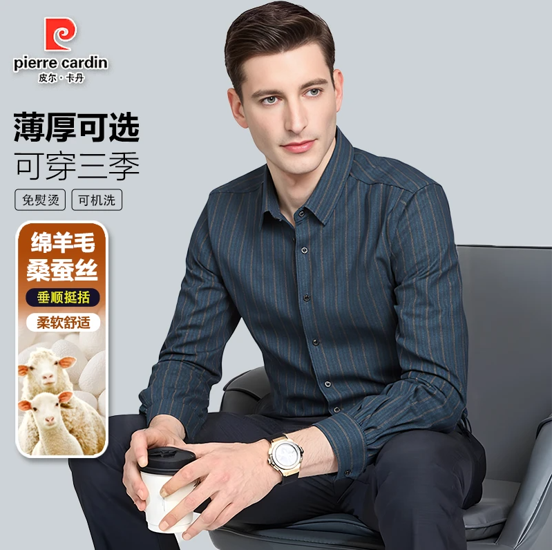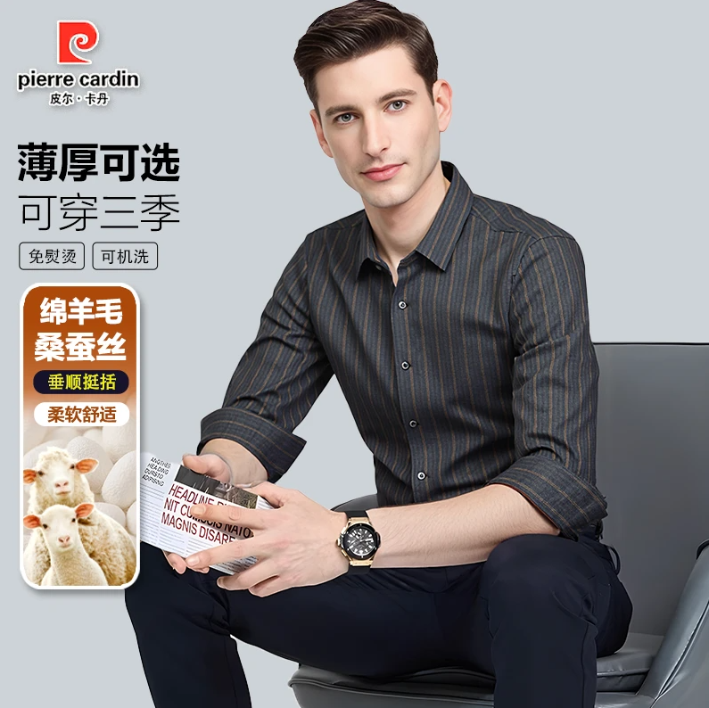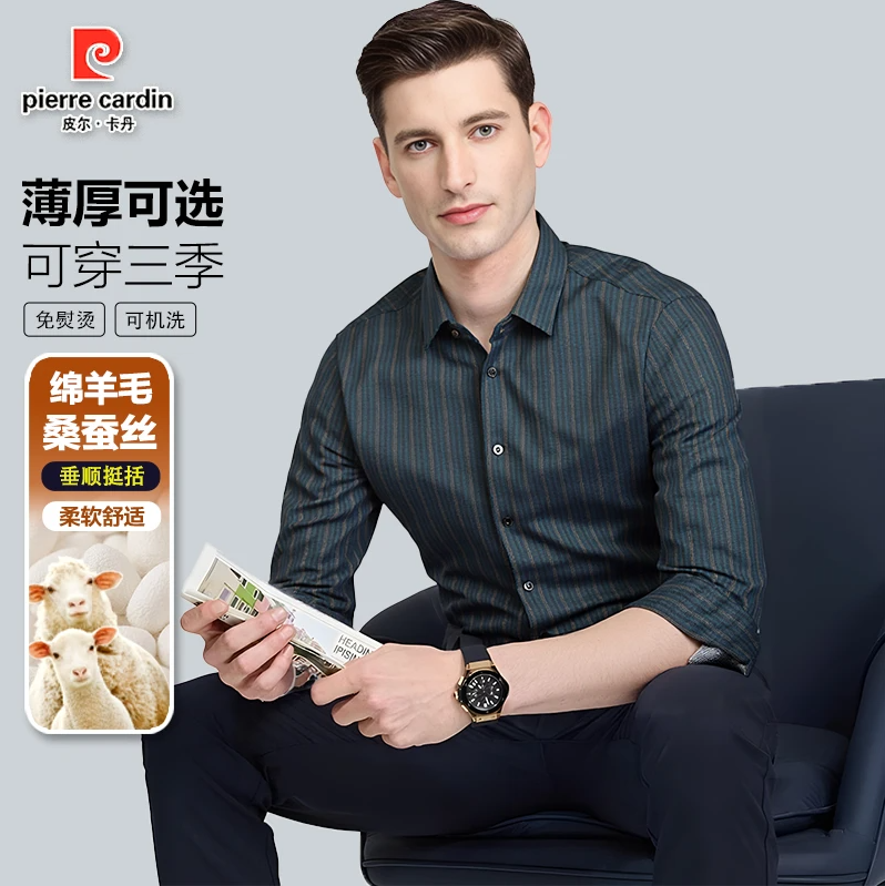 皮尔卡丹绵羊毛桑蚕丝长袖衬衫男