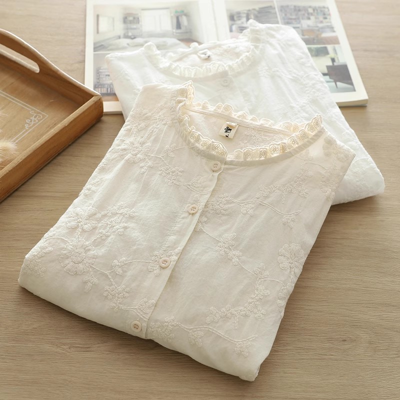 文艺小清新蕾丝花边木耳领刺绣花朵纯棉正肩白衬衫女长袖打底衫潮
