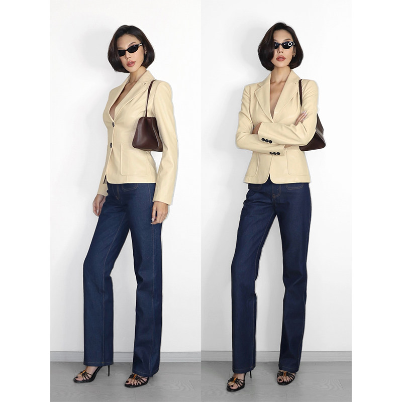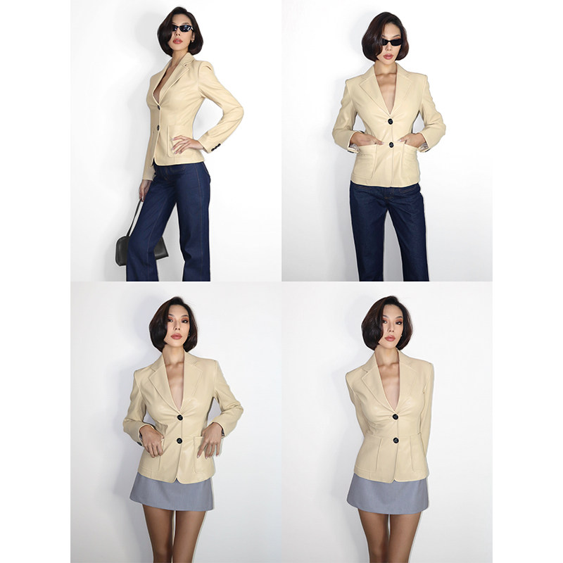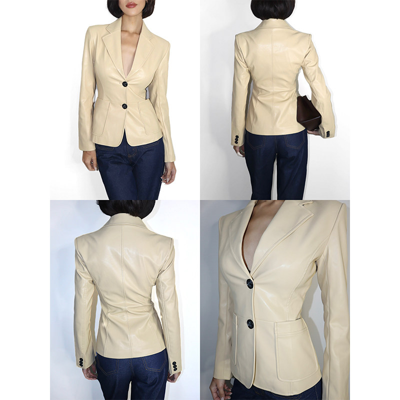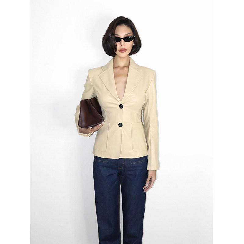VanessaLab 辣妹仿绵羊皮西装女短款修身收腰显瘦米黄色皮衣外套