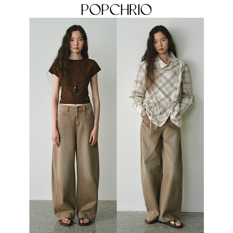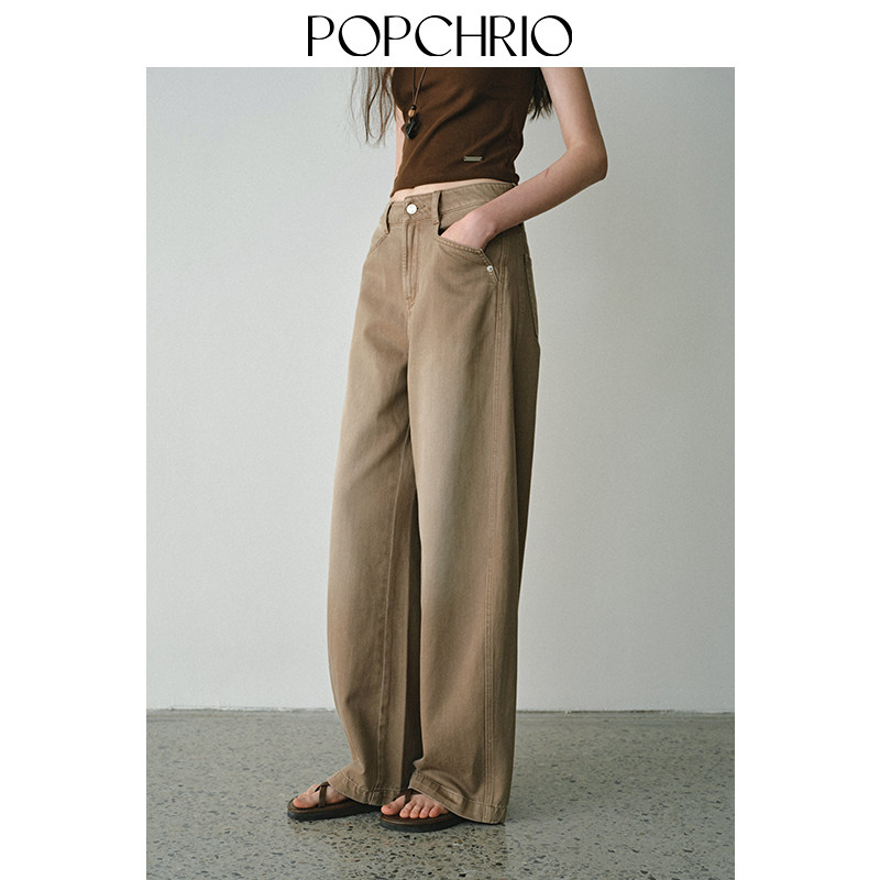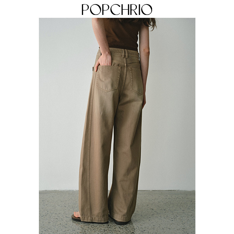 POPCHRIO欧可芮◆复古水洗卡其色中腰牛仔裤宽松休闲弯刀拖地裤子