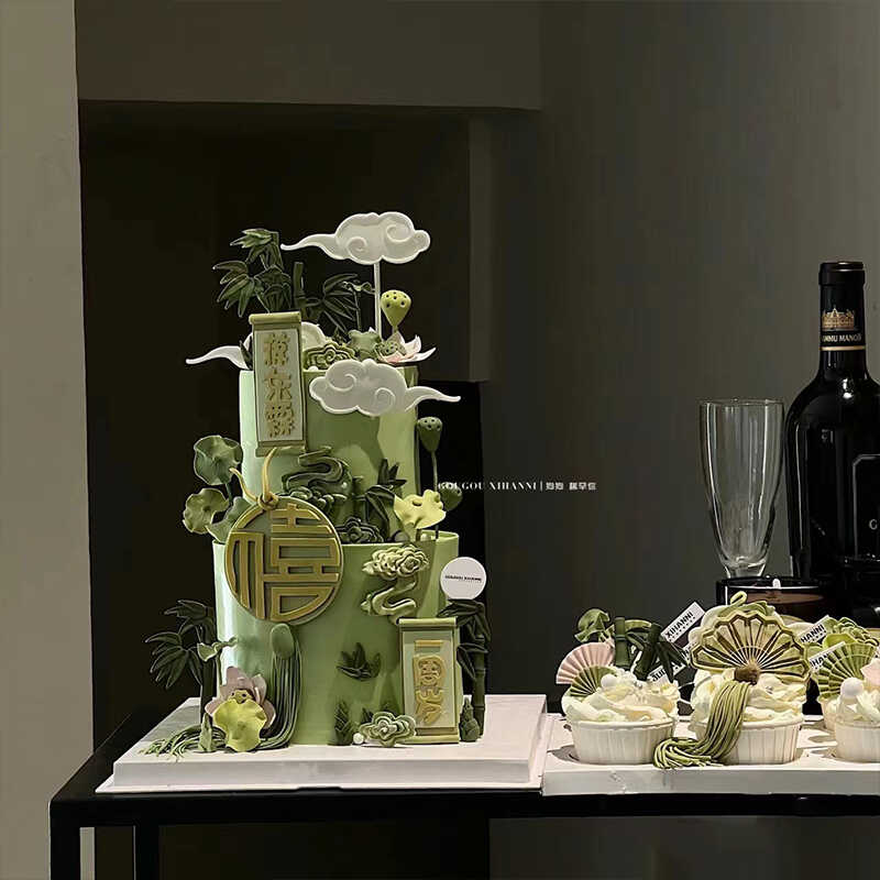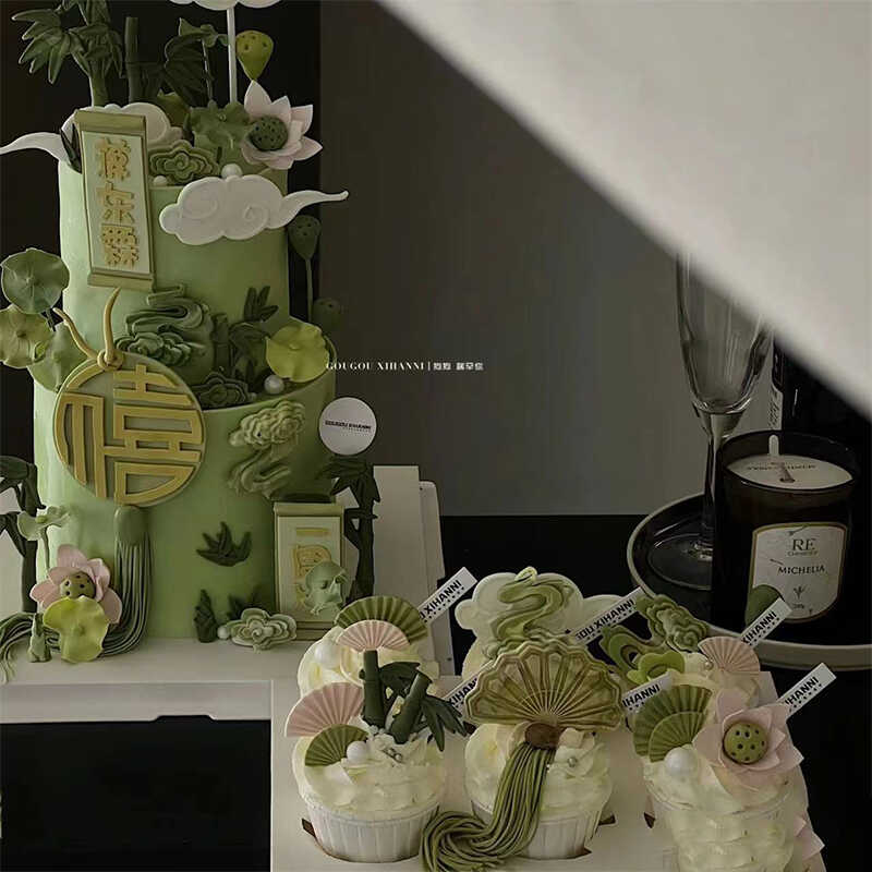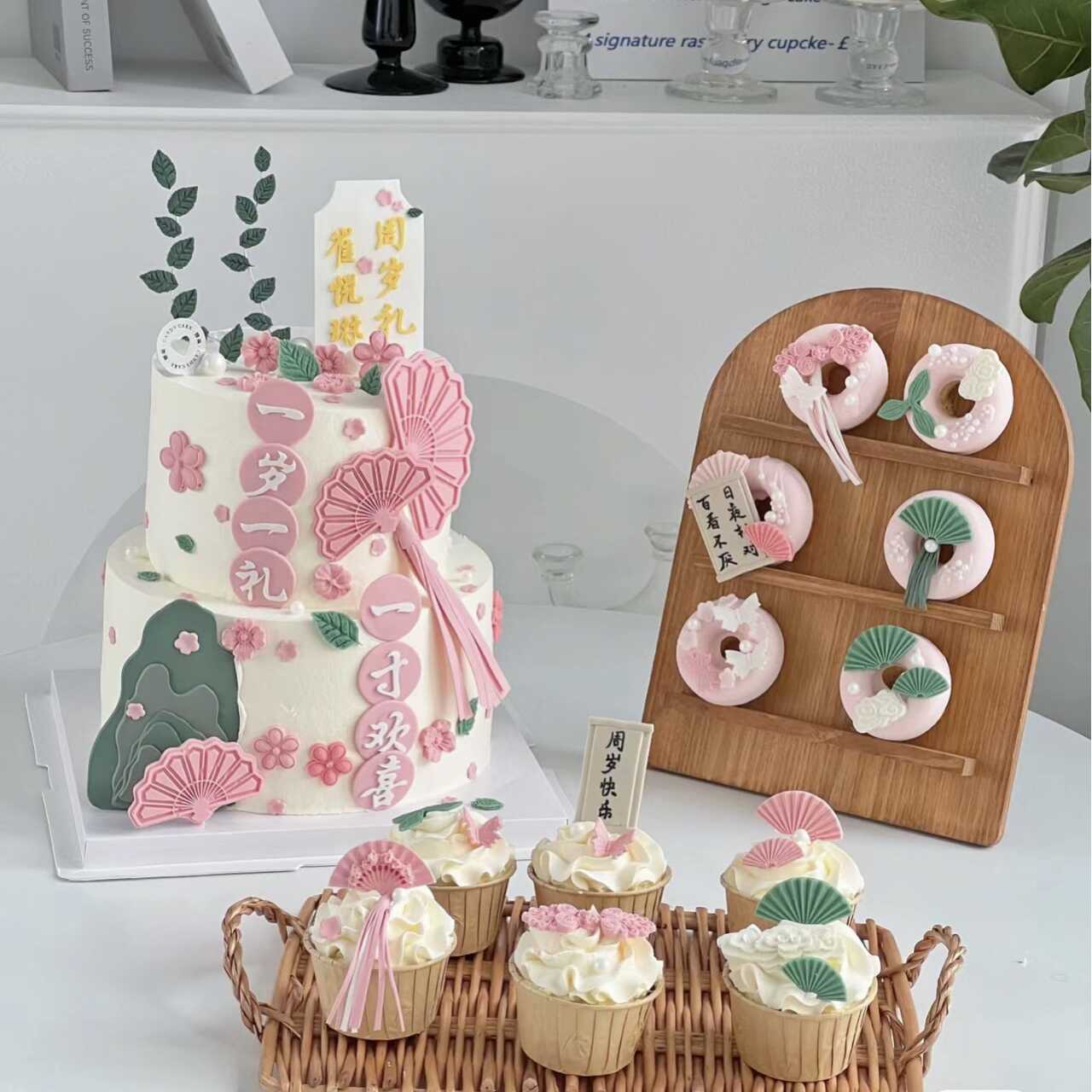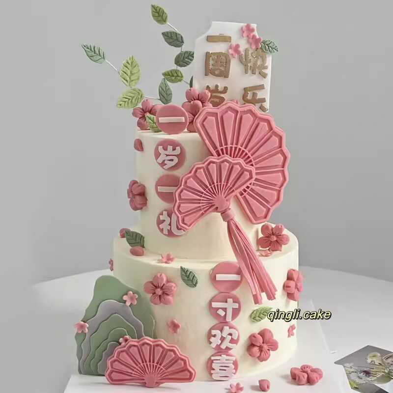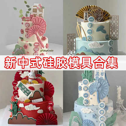 新中式蛋糕装饰硅胶模具一岁一礼折扇祥云祝寿订婚巧克力翻糖摆件