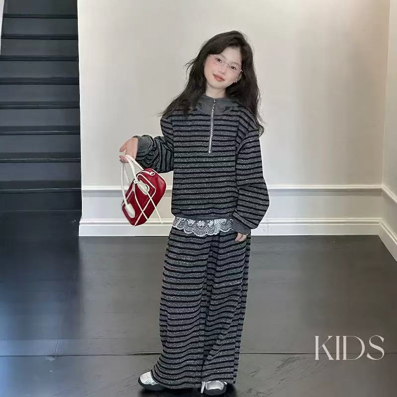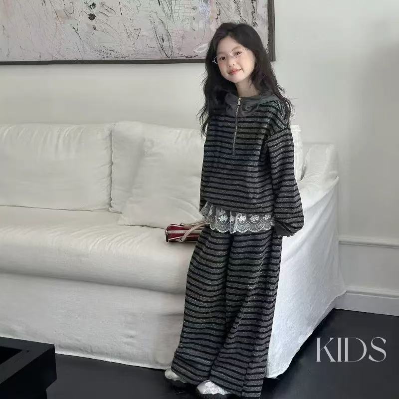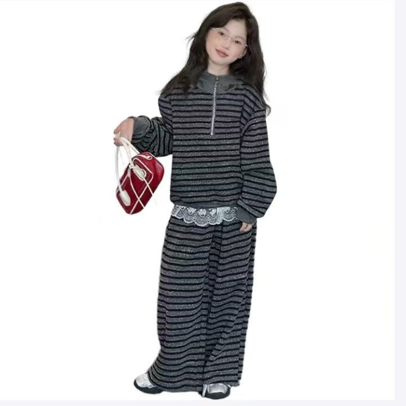 女童2025春秋新款中大童条纹帽衫套装女孩时髦卫衣阔腿裤两件套潮
