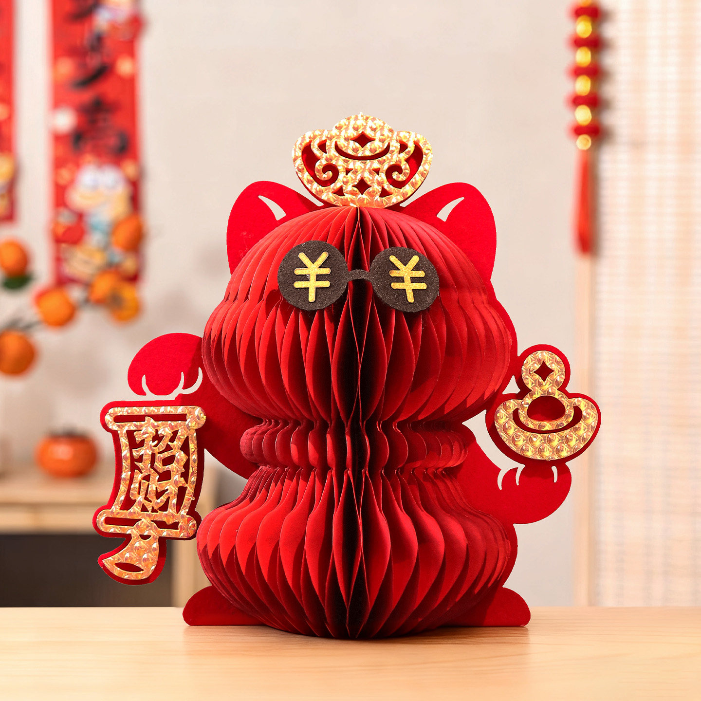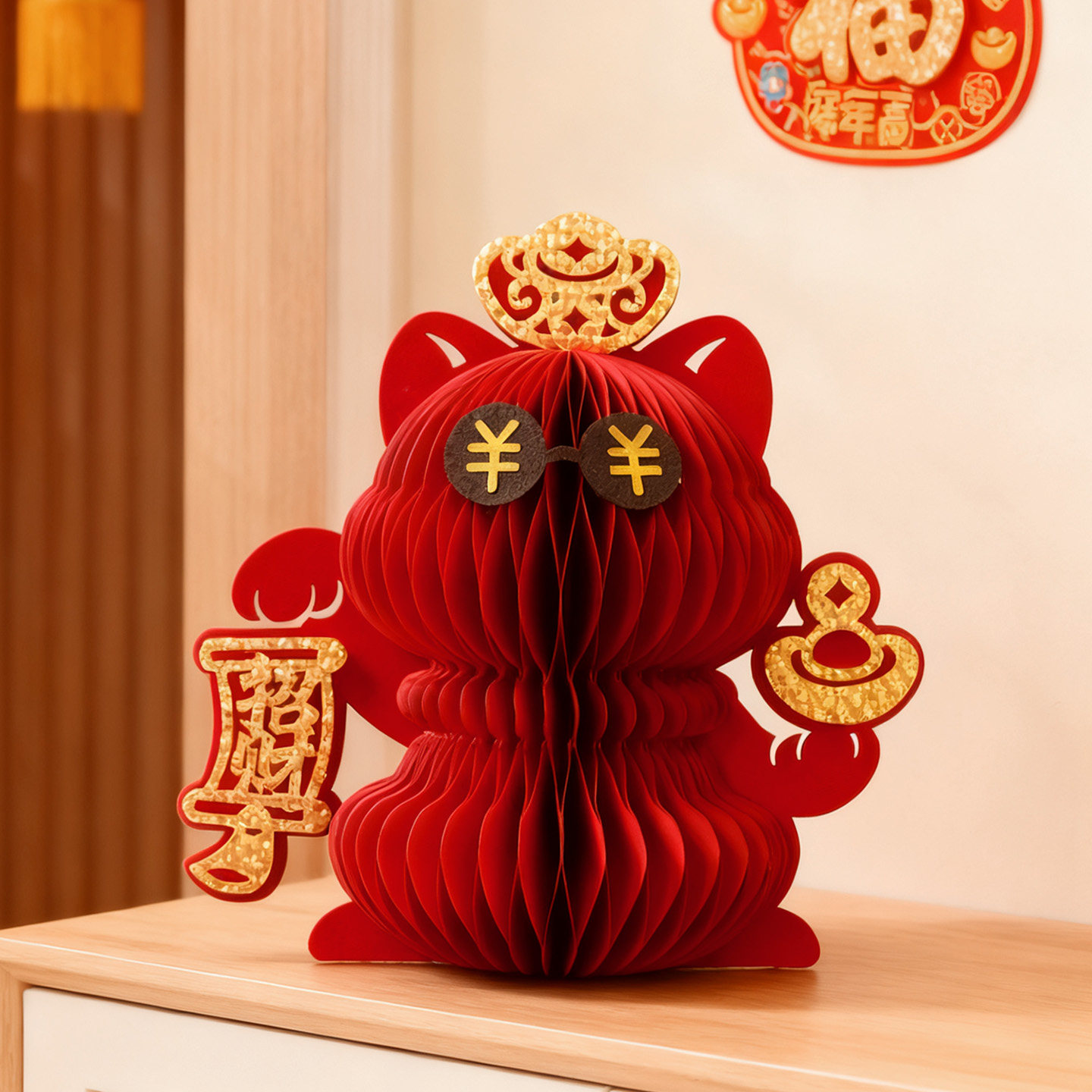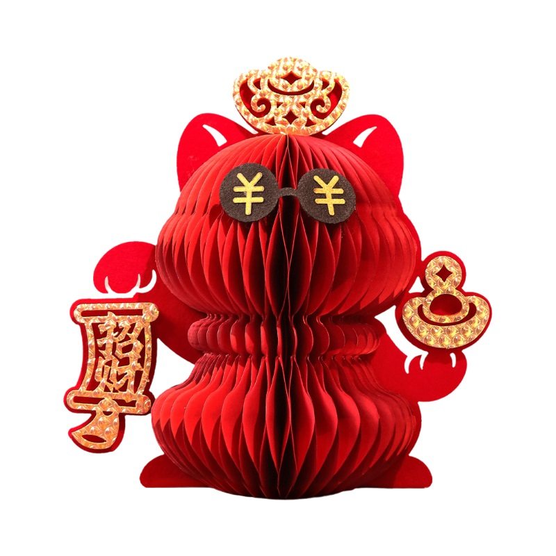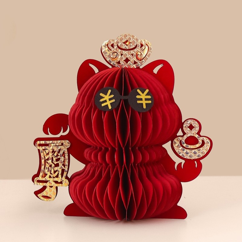 红色招财猫蜂窝纸艺新年摆件