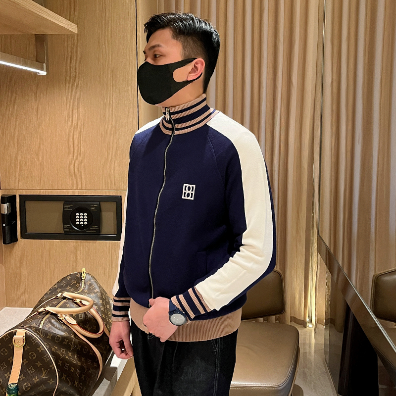 开衫针织高领拼色毛衣休闲运动风