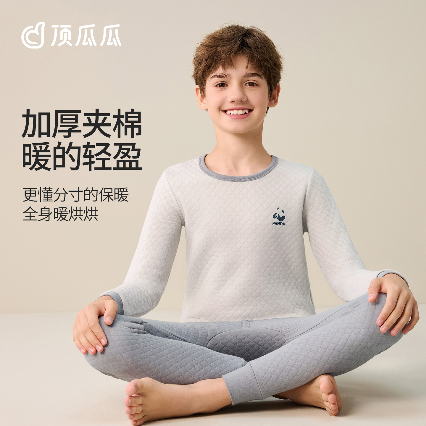 顶瓜瓜男童保暖内衣套装纯棉儿童秋衣秋裤三层夹棉中领青少年男孩