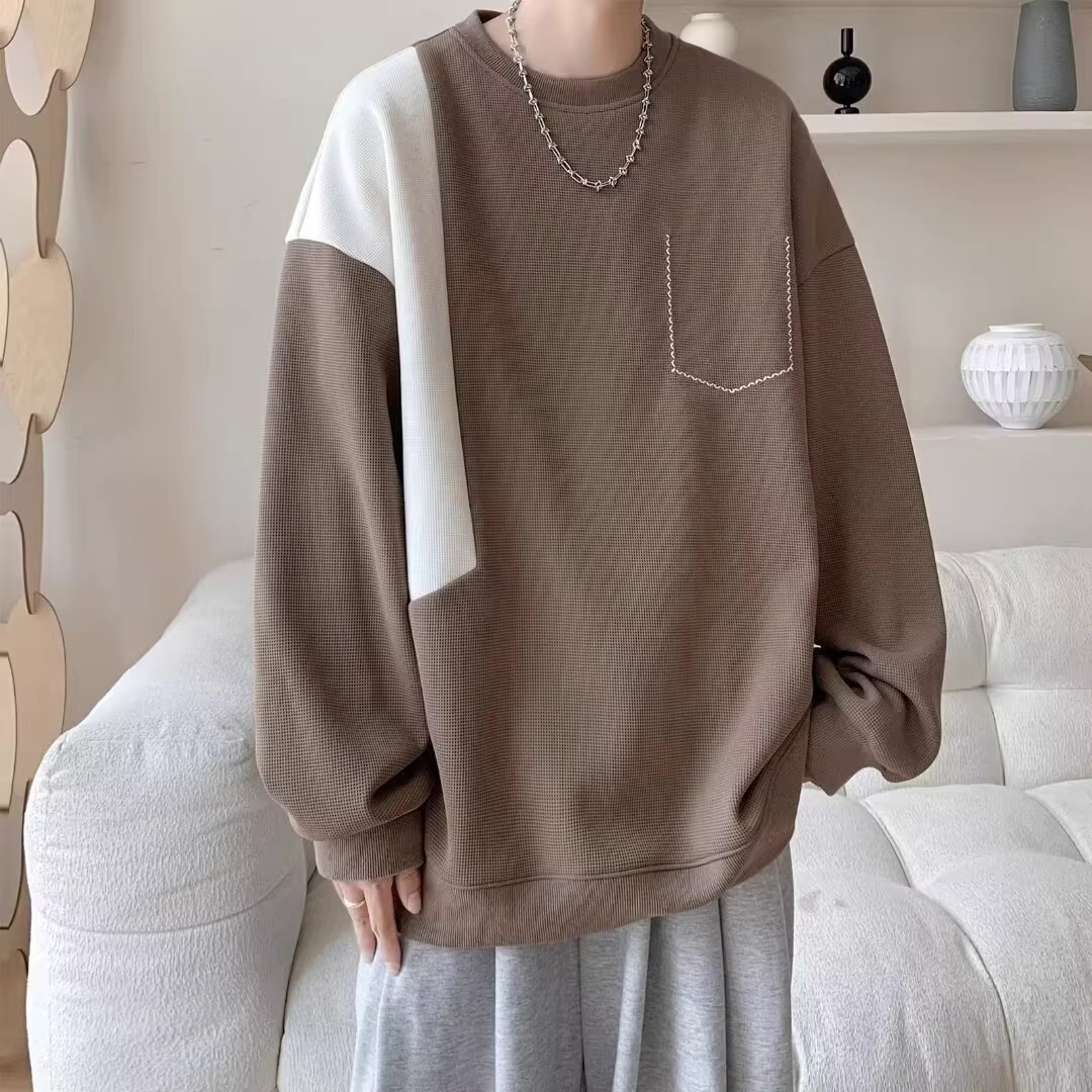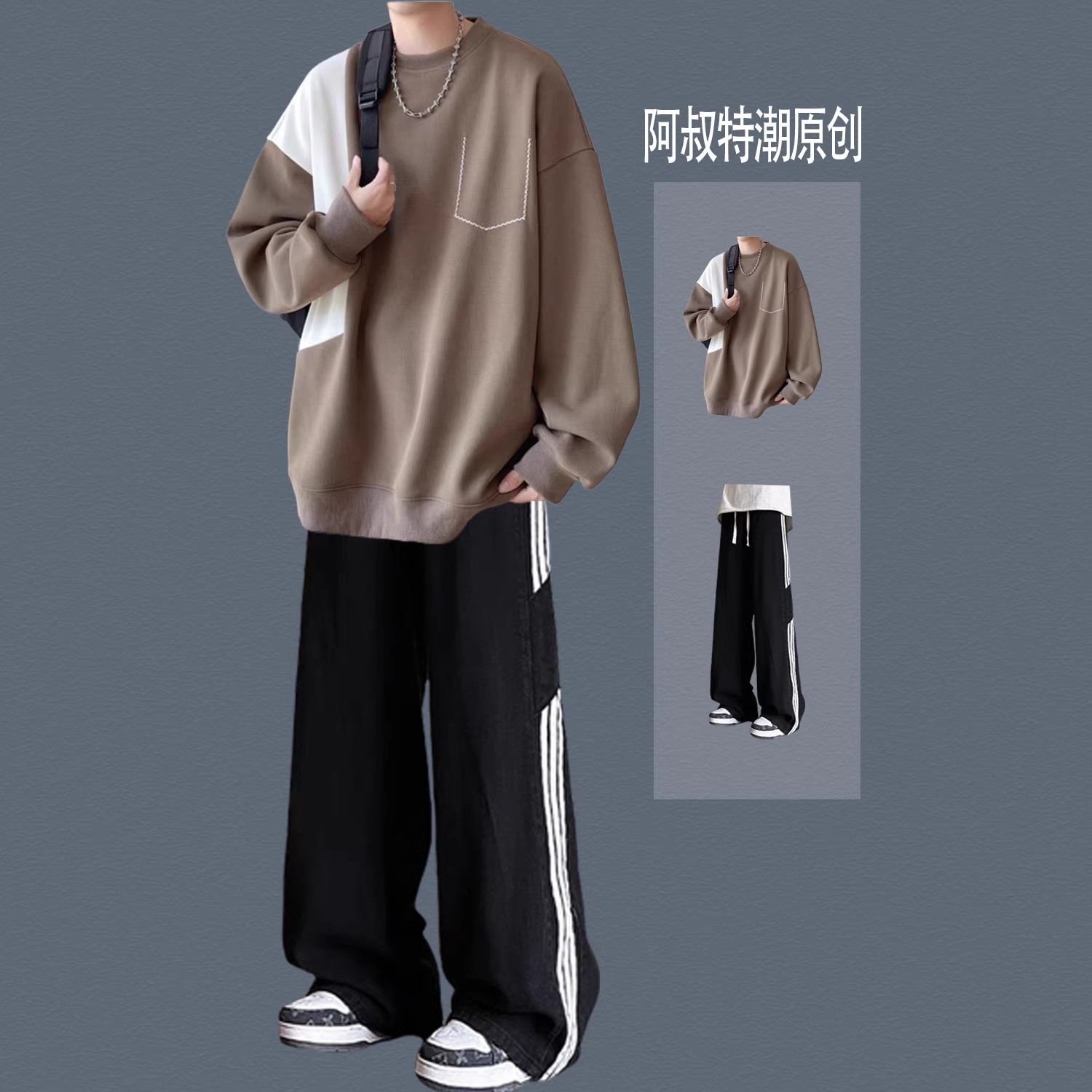 美式拼色潮牌卫衣男2024新款春秋款套装痞帅高级感学生搭配一整套