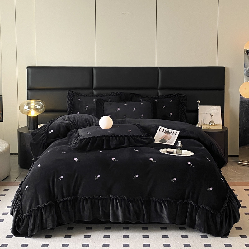 高级黑牛奶绒三四件套双面珊瑚加绒加厚保暖御寒被套床笠玫瑰花边