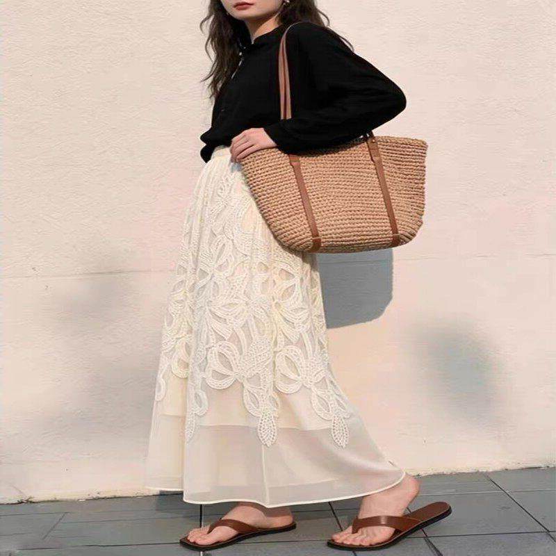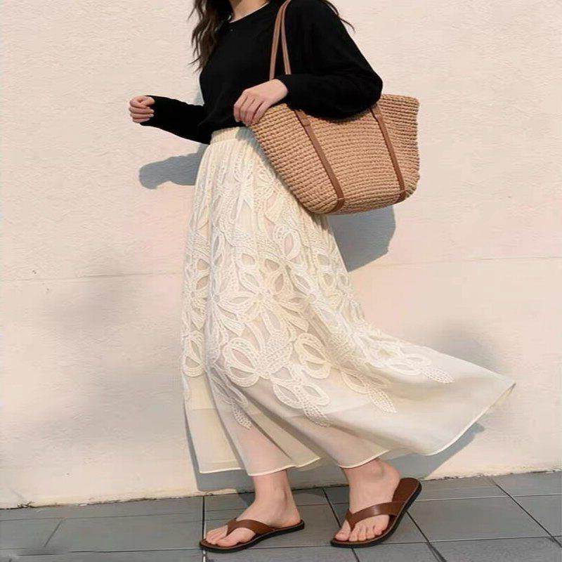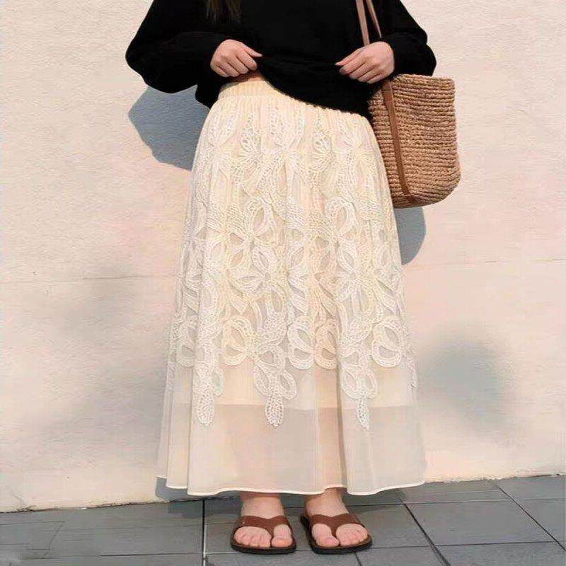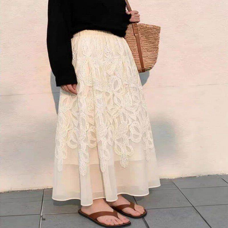 牛X货 巨炸裂!白色蕾丝刺绣网纱半身裙女春季松紧高腰中长a字裙