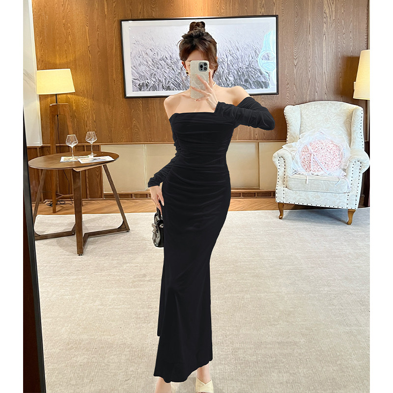 适合150cm小个子春装显高加小码女装高端网纱露肩鱼尾裙礼服长裙
