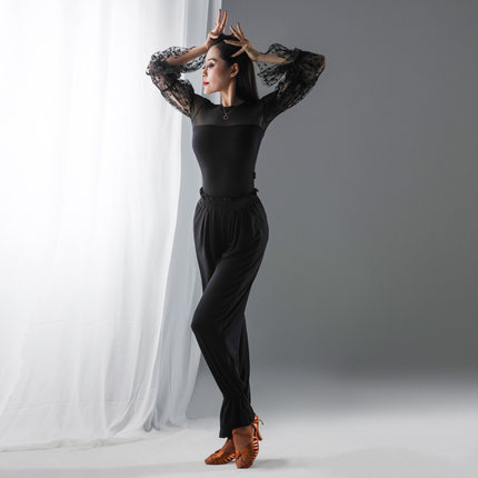 康尼新款拉丁舞裤女高腰舞蹈练功服摩登舞长裤国标舞阔腿花苞裤子