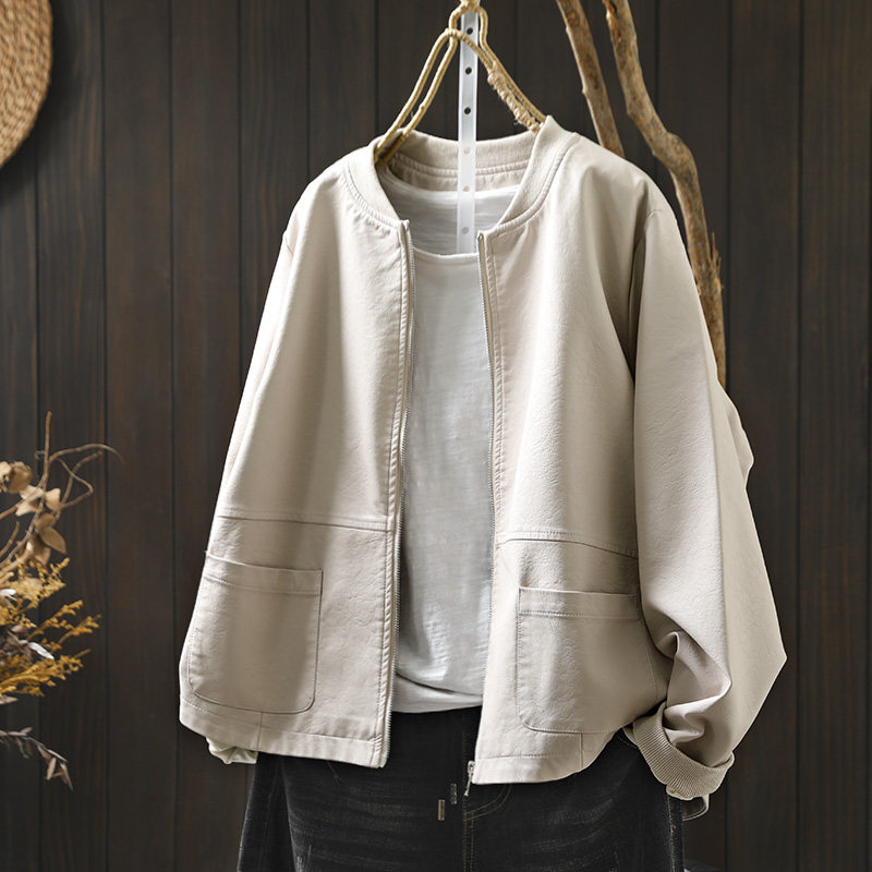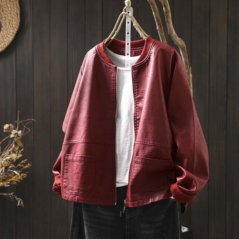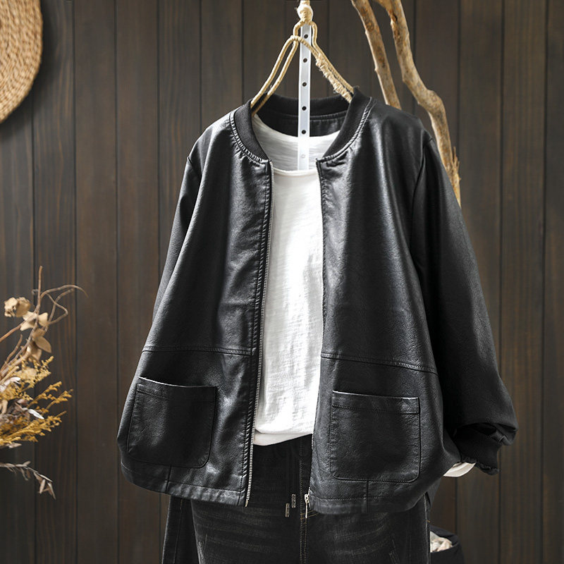 双口袋立领pu皮衣外套女宽松帅气春装新款港味棒球服夹克机车服潮