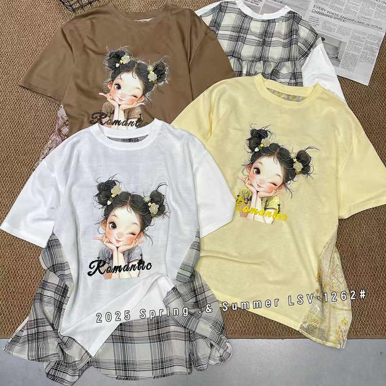 2025新款卡通印花短袖T恤女夏季时尚宽松显瘦体恤拼色上衣潮短袖